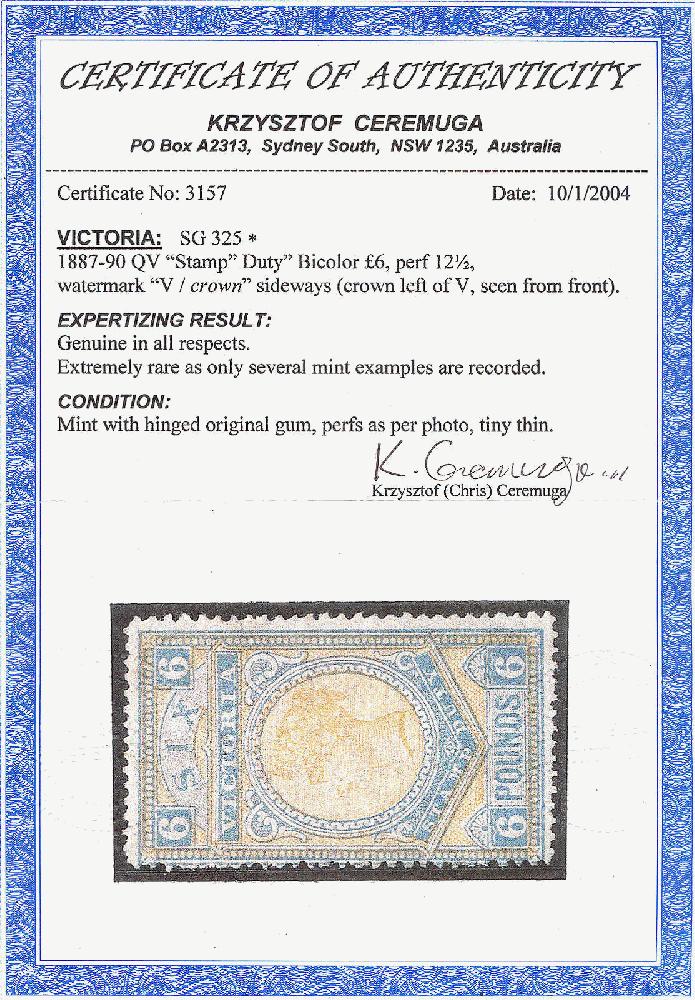| Zusatzinformationen und Suchstichworte: | 19. classicphil GmbH Auktion 12. - 13. September 2023 Los 1123 Victoria 1887-90, £6, gelb und fahlblau, Wasserzeichen liegend (Krone links von V, frontale), gezähnt 12 1/2, großer Teil Originalgummi, leicht links zentriert, großer Teil Originalgummi, auf dünnem gezähnt der Ordnung halber erwähnt, äußerst selten, frisch und gesucht, Prüfungsbefund Ceremuga, feinst bis Pracht! Schätzpreis 20,000 EUR Ausruf 4.800,00 EUR |