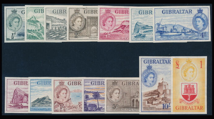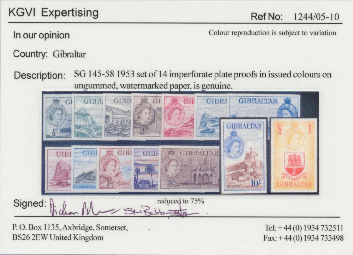 | Zusatzinformationen und Suchstichworte: | Doreen Royan & Associates Shop - Online Los 15462 Gibraltar Gibraltar 1953 Queen Elizabeth II Imperforate Plate Proofs of the complete definitive issue in issued colours. Ungummed, Watermarked paper. King George VI Expertising Certificate No. 1244/05-10 (2010). Provenance : Barclays Bank (1987). AN EXCEEDINGLY RARE AND IMPORTANT EXHIBITION ITEM Preis auf Anfrage |