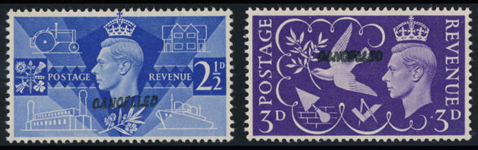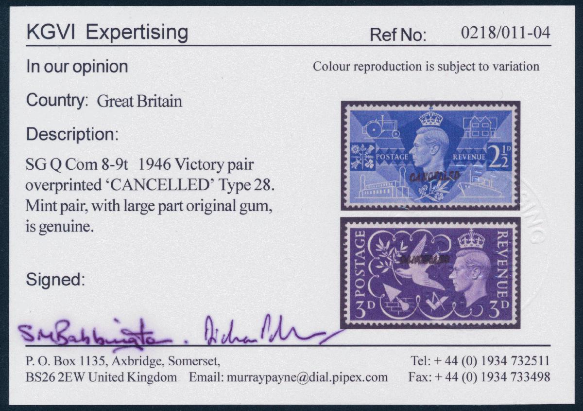 | Zusatzinformationen und Suchstichworte: | Doreen Royan & Associates Shop - Online Los 21125 (D) Grossbritannien Great Britain 1946 Victory Issue. 2½d. ultramarine plus 3d. violet. Variety, ‘Overprinted ‘CANCELLED’ (Type 28)’. Superb mint condition. KGVI Expertising Certificate No. 0218/011-04 (2004). EXCEEDINGLY RARE Festpreis 2.000,00 GBP |