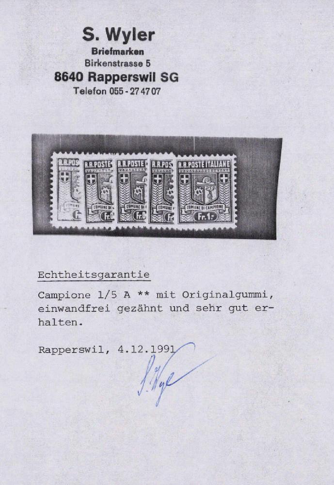 | Zusatzinformationen und Suchstichworte: | 44. Jean-Paul Bach Auktion 13. - 16. Juli 2023 Los 5599 Campione 1944, Gemeindemarken der italienischen Exklave Campione, grosse Zähnungslöcher, tadellos postfrische Serie, fehlerfrei. Attest BP. Kat. 700.-- Ausruf 200,00 CHF |