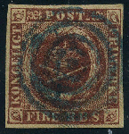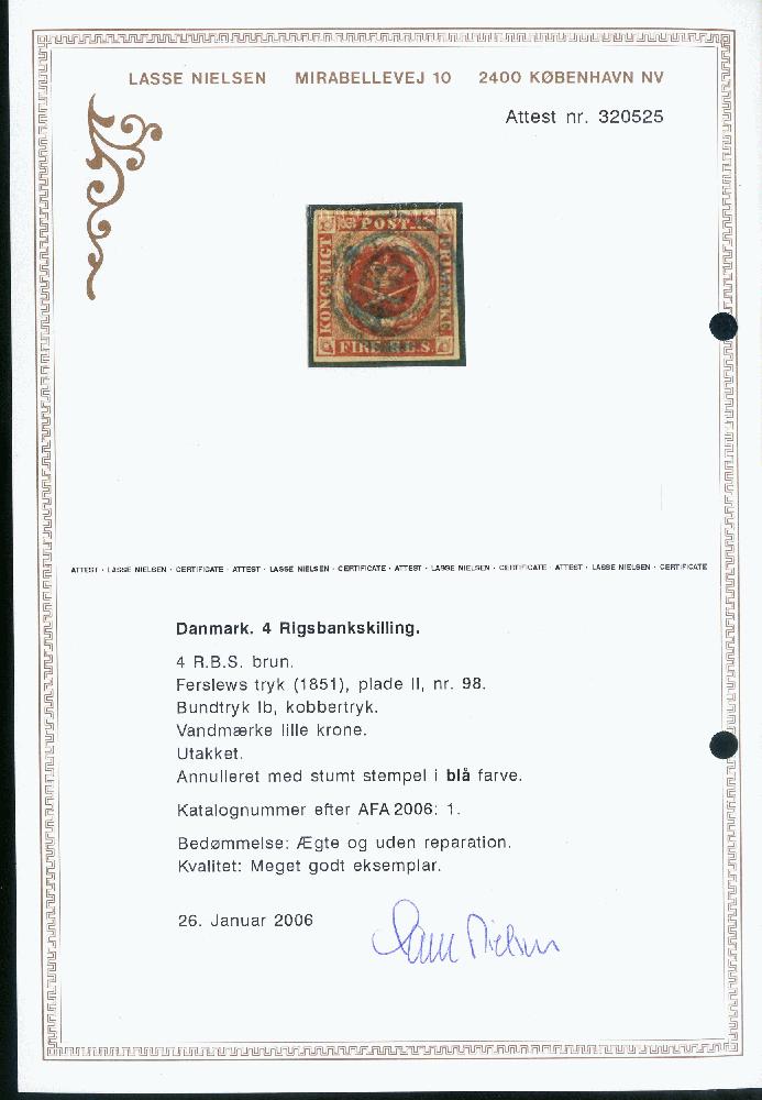 | Zusatzinformationen und Suchstichworte: | Skanfil Auktion - Frühling Auktion 2023 4. - 7. Mai 2023 Los 2314 Dänemark 1. 4 RBS Ferslew. Pl. II, nr.98 annulleret med stumt stempel i BLÅ farve. Fint merke med attest Nielsen Zuschlag 850,00 NOK |