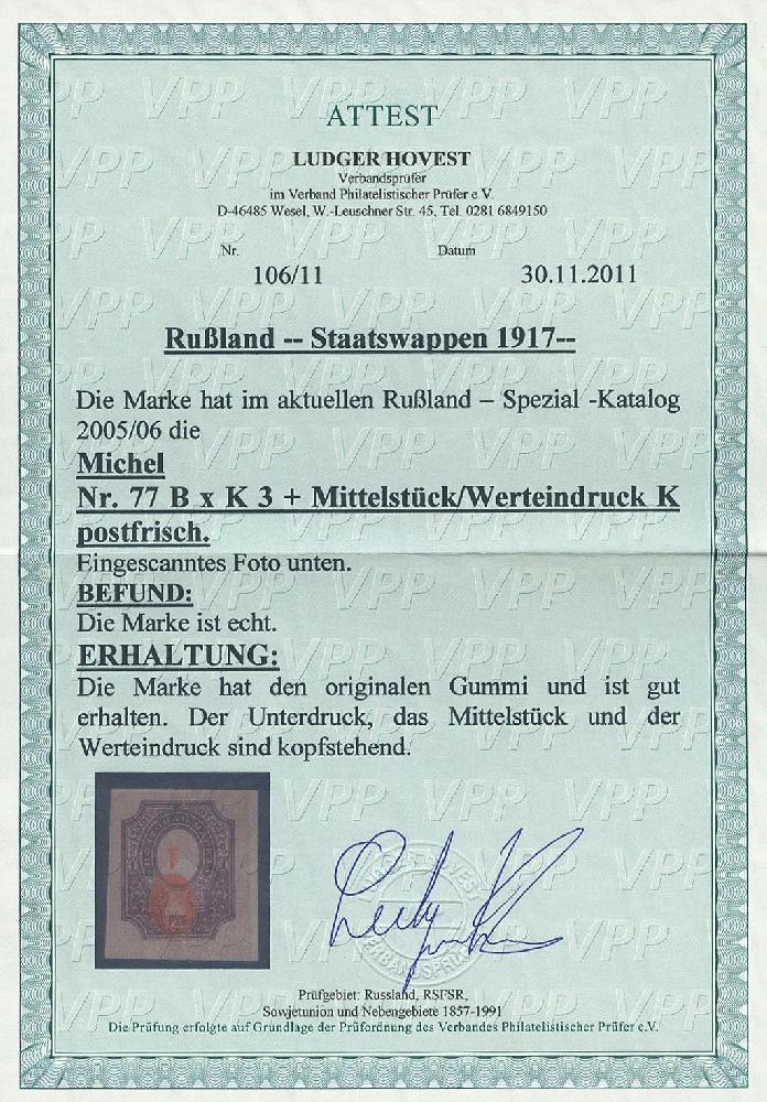 | Zusatzinformationen und Suchstichworte: | Ulrich Felzmann Shop Los 462896 Russland 1 R ungezähnt, postfrisches Prachtstück mit Abart: der Unterdruck, das Mittelstück und der Werteindruck sind kopfstehend, Fotoattest Hovest Festpreis 60,00 EUR |