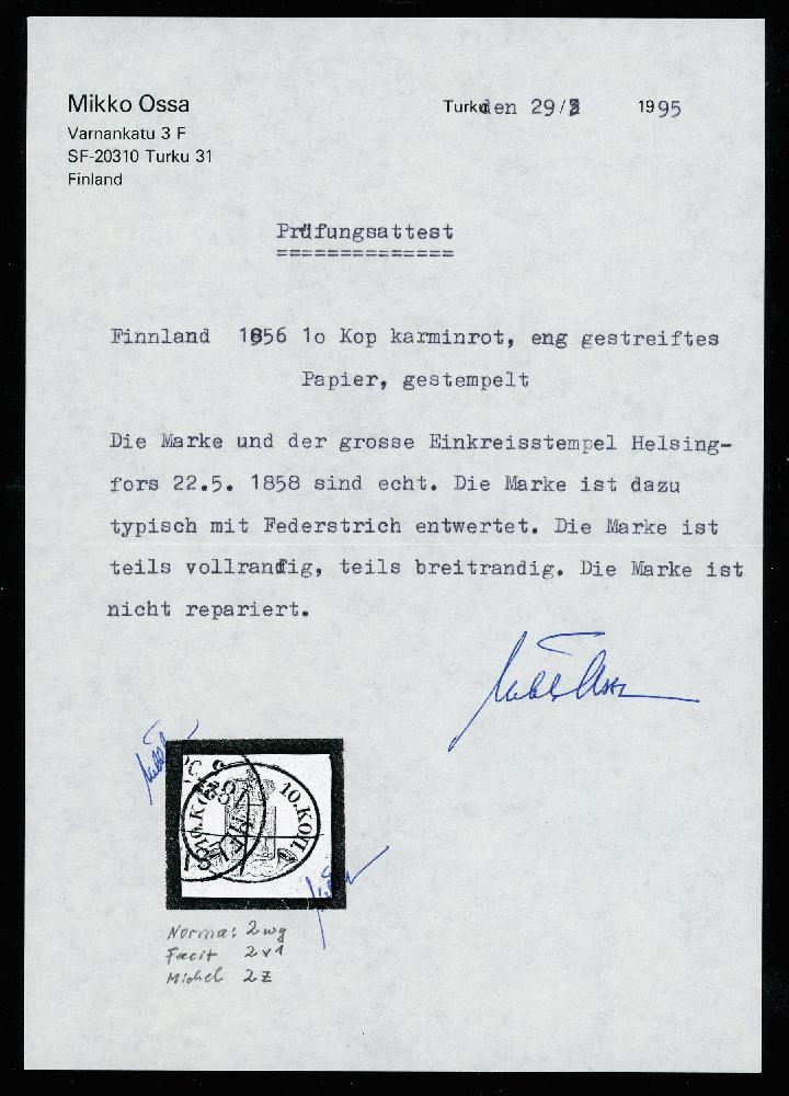 | Zusatzinformationen und Suchstichworte: | Klüttermann - 6. Auktion 27. Juli - 4. August 2023 Los 10683 Finnland 10 Kopeken rosa, senkrecht eng gestreiftes Papier, breitrandiges Luxusstück mit Federkreuz und K1 HELSINGFORS, FA Ossa Ausruf 350,00 EUR |