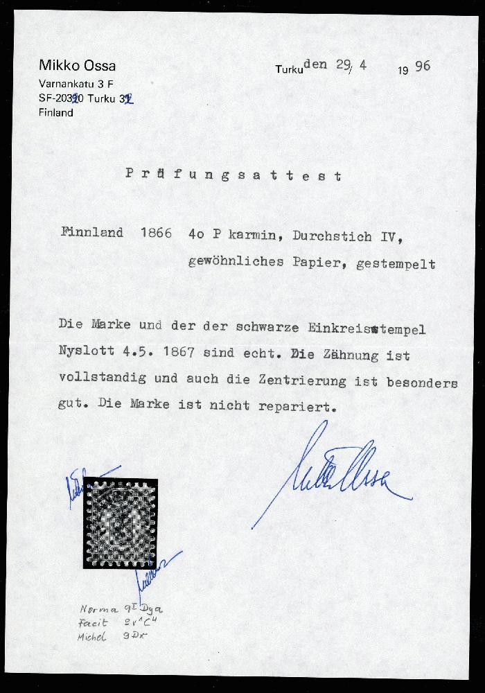 | Zusatzinformationen und Suchstichworte: | Klüttermann - 6. Auktion 27. Juli - 4. August 2023 Los 10737 Finnland 40 Penni rosakarmin auf einfachem blassrosa Papier Durchstich D, Luxusstück mit allen Zungen und zentrischem K1 NYSLOTT 4/5 1877, eine Ausnahmestück dieser extrem seltenen Marke mit FA Ossa Katalogwert: 4000 Ausruf 1.500,00 EUR |