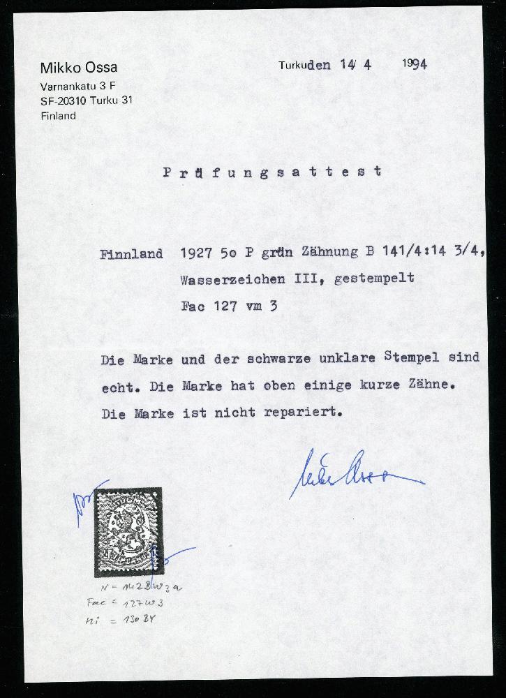 | Zusatzinformationen und Suchstichworte: | Klüttermann - 6. Auktion 27. Juli - 4. August 2023 Los 10802 Finnland 50 P. Wz. Y Zähnung B, sauber gestempelt, ein paar unmerkl. kurze Zähne, sonst tadellos mit FA Ossa Katalogwert: 500 Ausruf 120,00 EUR |