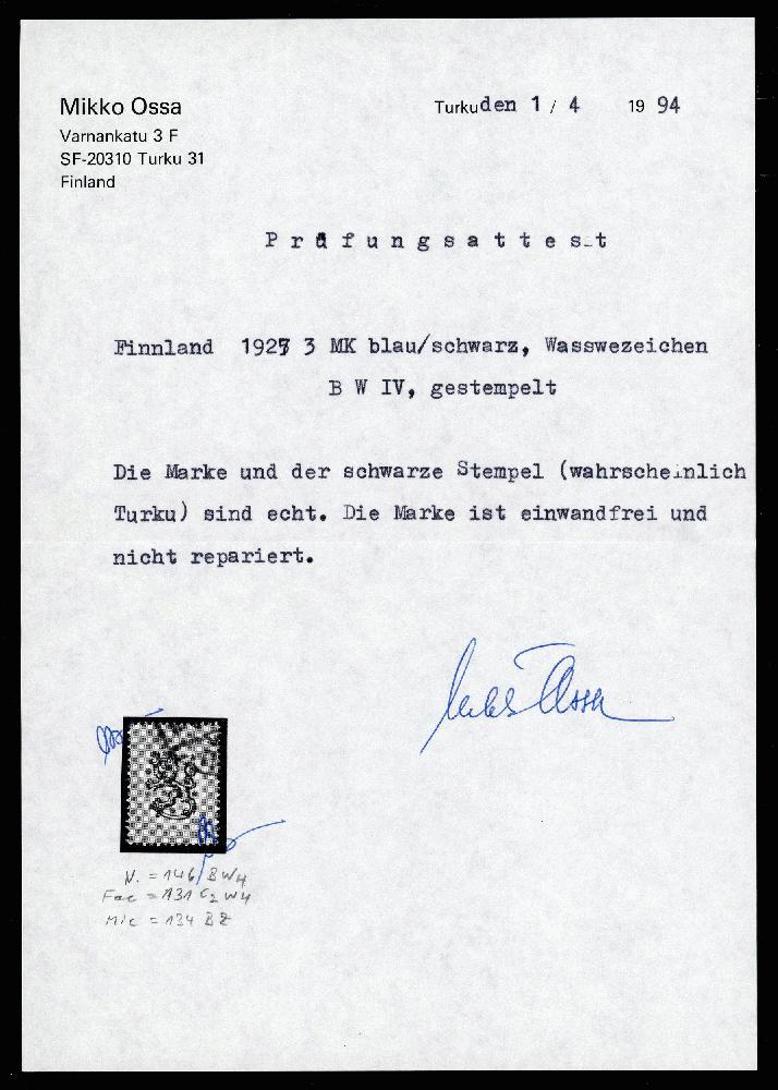 | Zusatzinformationen und Suchstichworte: | Klüttermann - 6. Auktion 27. Juli - 4. August 2023 Los 10807 Finnland 3 Mk. Wz. Z Zähnung B, tadellos gestempelt mit FA Ossa, seltene Marke! Katalogwert: 700 Zuschlag 225,00 EUR |