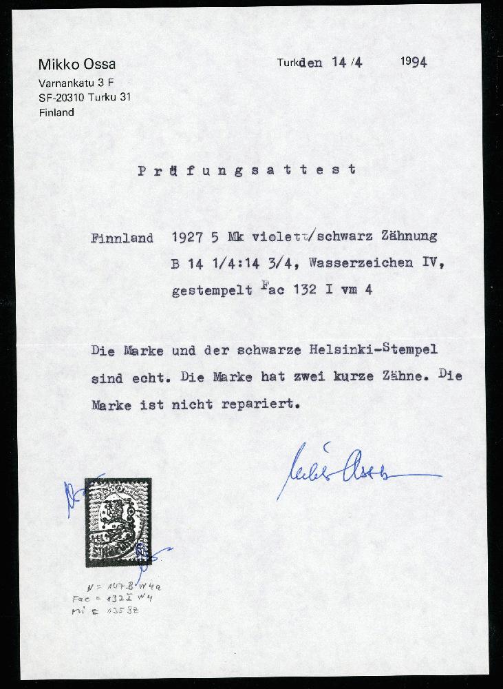| Zusatzinformationen und Suchstichworte: | Klüttermann - 6. Auktion 27. Juli - 4. August 2023 Los 10809 Finnland 5 Mk. Wz. Z Zähnung B, sauber gestempelt und bis auf 2 kurze Zähne tadellos, FA Ossa Katalogwert: 380 Ausruf 100,00 EUR |