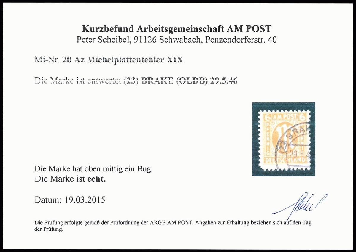 | Zusatzinformationen und Suchstichworte: | Dr. Reinhard Fischer 193. Auktion 21. - 22. Juli 2023 Los 6629 Bizone 6 Pfg AM-Post, Plattenfehler "linke 6 gebrochen", gest. BRAKE 29.5.46, Fotobefund Arge/Scheibel: "echt, oben mittig ein Bug", Mi. 350.- Ausruf 60,00 EUR |