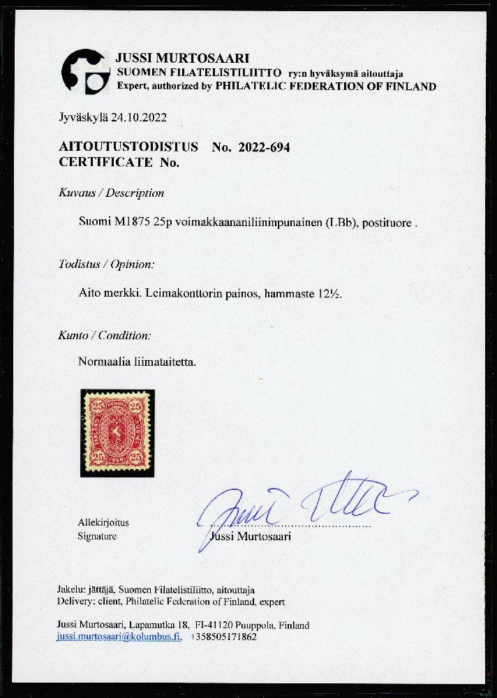 | Zusatzinformationen und Suchstichworte: | Klüttermann - 6. Auktion 27. Juli - 4. August 2023 Los 10754 Finnland 25 P. anilinrot ((LBb), tadellos postfrisch, FA Murtosaari Zuschlag 40,00 EUR |