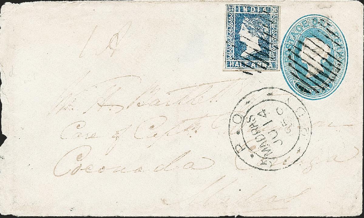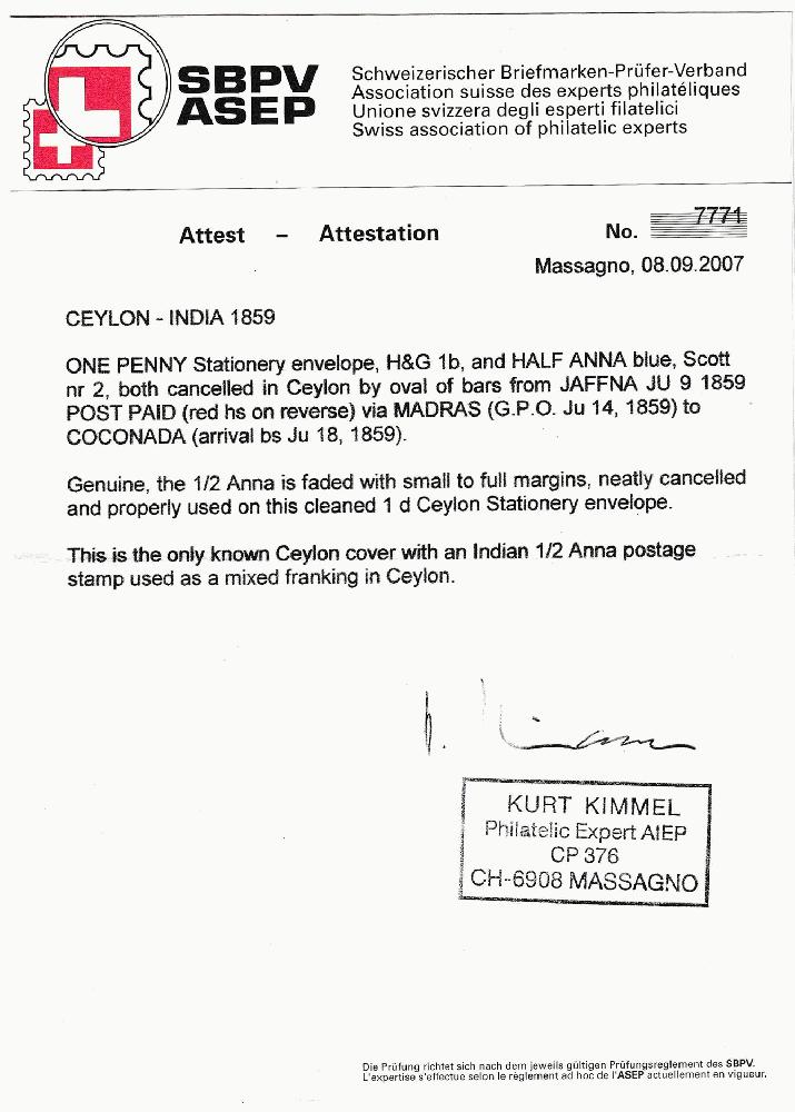 | Zusatzinformationen und Suchstichworte: | Robert A. Siegel - The Magnolia Collection: India Postal History & Stamps Used Abroad Los 223 Ceylon Used in Ceylon, 1854, -1/2a Blue, Die III (2E; SG 8a). Full margins to clear, used on Ceylon 1p Blue entire, stamp and indicia tied by oval grid cancel with light strike of red Jaffna Jul. 9, 1859 circular datestamp, addressed to Coconada, India, Madras transit and Coconada arrival datestamps, cover lightly cleaned and with edgewear FINE. A RARE AND LATE USE OF A HALF-ANNA LITHOGRAPH ON CEYLON ENTIRE TO INDIA. THIS IS THE ONLY RECORDED USE OF AN INDIAN LITHOGRAPH IN CEYLON Ausruf 1.500,00 USD |