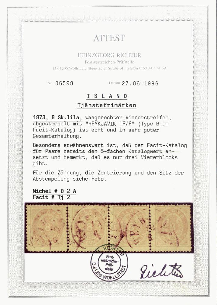 | Zusatzinformationen und Suchstichworte: | 203. Auktionshaus Schulz Auktion 17. August 2023 Los 2028 Island 8 Sk. lila waagerechter 4-er Streifen (min. gestüzt) entwertet mit K1 "Reykjavík 16/6" (Type B) in sehr guter Gesamterhaltung, FFA Richter und BPSB, lt. Attest "Besonders erwähnenswert ist, dass der Facit-Katalog für Paare bereits den 5-fachen Katalogwert ansetzt und bemerkt, dass es nur drei Viererblöcke gibt, wohl möglich Unikat" (Alter Ausrufpreis: 1000 EUR) GEBOT |