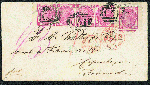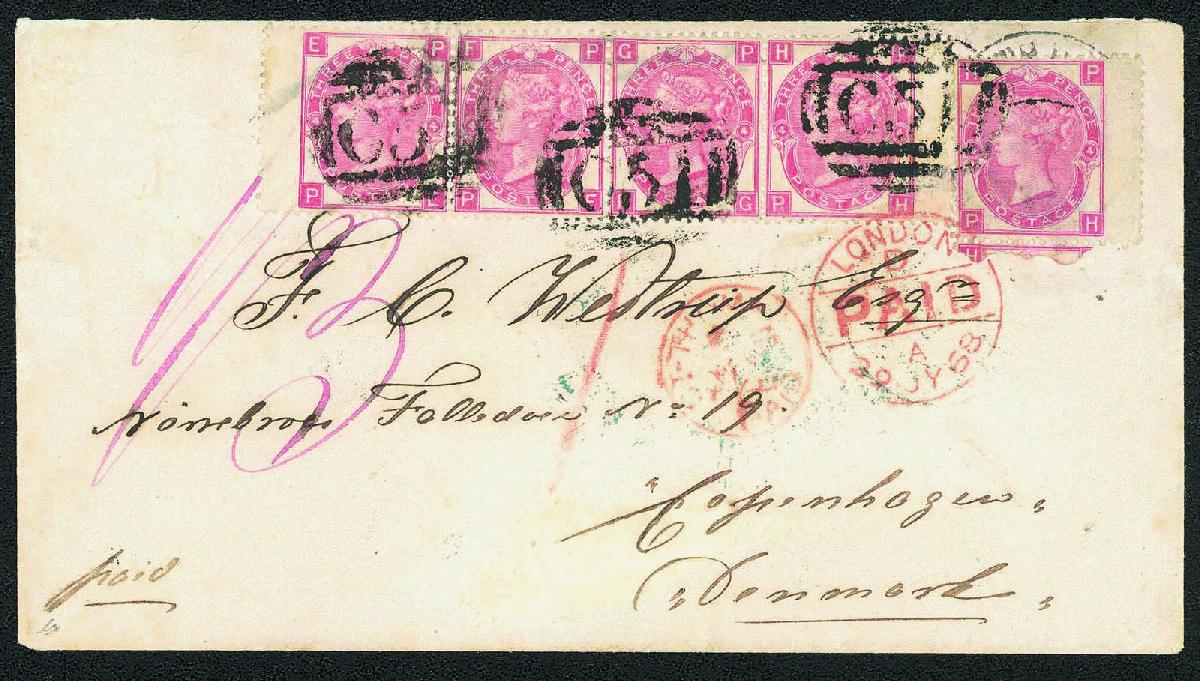 | Zusatzinformationen und Suchstichworte: | Gert Müller 119. Auktion 24. - 26. August 2023 Los 3040 Dänisch Westindien BRITISCHES POSTAMT ST.THOMAS: Grossbritannien, 3 P. rosa, Platte 4 (Wasserzeichen Rosenzweig), Einzelstück und waagerechter Viererstreifen, farbfrisch, jeweils mit Breitrand, auf wundervollem Brief, aufgegeben in Frederikstad mit K1 "FREDERIKSTAD 11.7.(1868)", weiterbefördert an das britische Postamt in St. Thomas und dort frankiert mit Nummernstempeln "C51" und rotem K1 "ST.THOMAS PAID" versehen nach Copenhagen/Dänemark mit rotem Transitstempel "LONDON PAID 29.JY.68" und rückseitigen Transit- und Ankunftsstempeln. Der Brief trägt die handschriftliche Taxierung "1/3" in rot. Ein phantastischer Brief von größter Seltenheit, wahrscheinlich Unikat! Fotoattest Royal Philatelic Society/London (SG Nr. Z7) Ausruf 5.000,00 EUR |