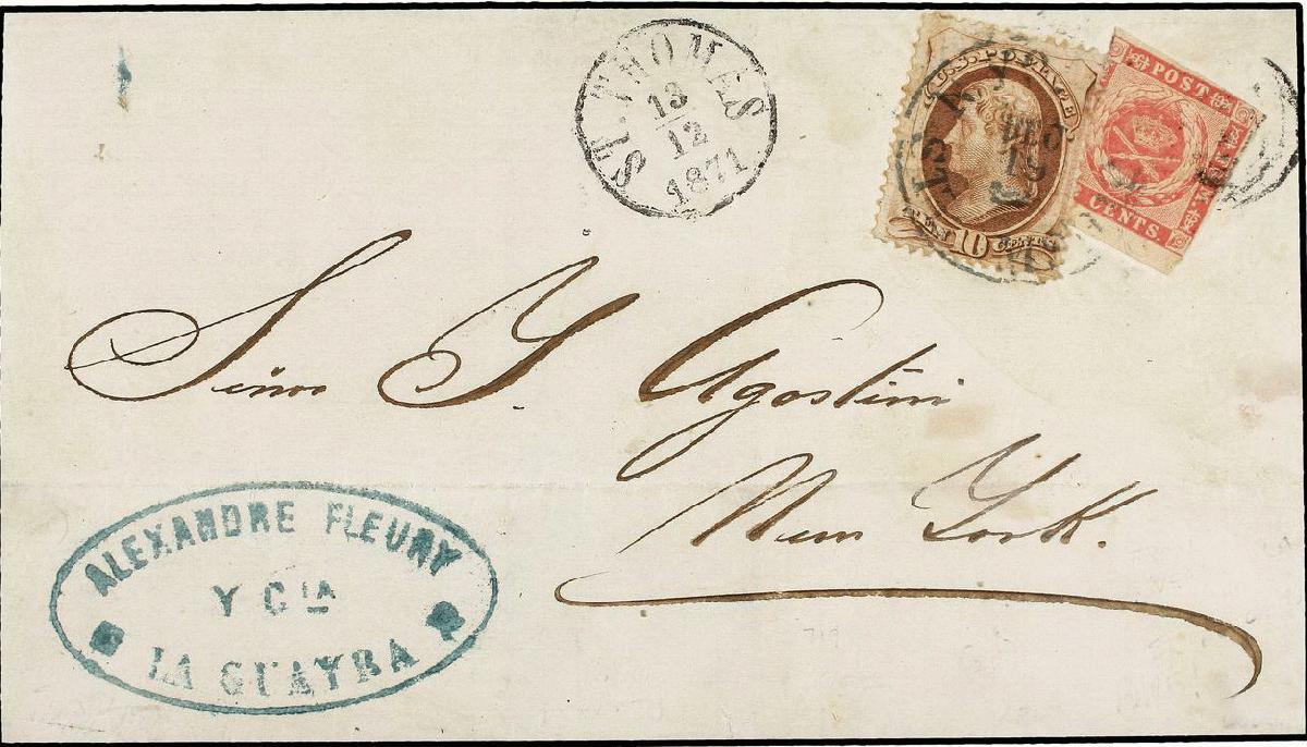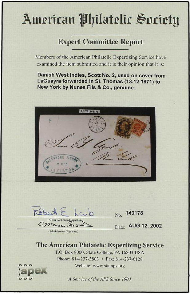 | Zusatzinformationen und Suchstichworte: | Soler y Llach - 788. Auktion 24. - 26. August 2023 Los 2103 Dänisch Westindien ANTILLAS DANESAS. 1871. Brief aus LA GUAIRA nach New York, privat befördert bis ST. THOMAS wohin frankiert mit DWI 3 c. rot, rasiert zu riesige Ränder, entwertet mit Kreis Ringstempel in schwarz; etwas überlappt von USA Geldschein 10 c. braun und beide Briefmarken entwertet mit NY/Dampfschiff in schwarz. Dänisch Post Office ST. THOMAS Kreisdatumsstempel auf der linken Seite (Dec 13). Eine herrliche Kombination Brief. Attest MOLLER, APS Ausruf 3.000,00 EUR |