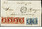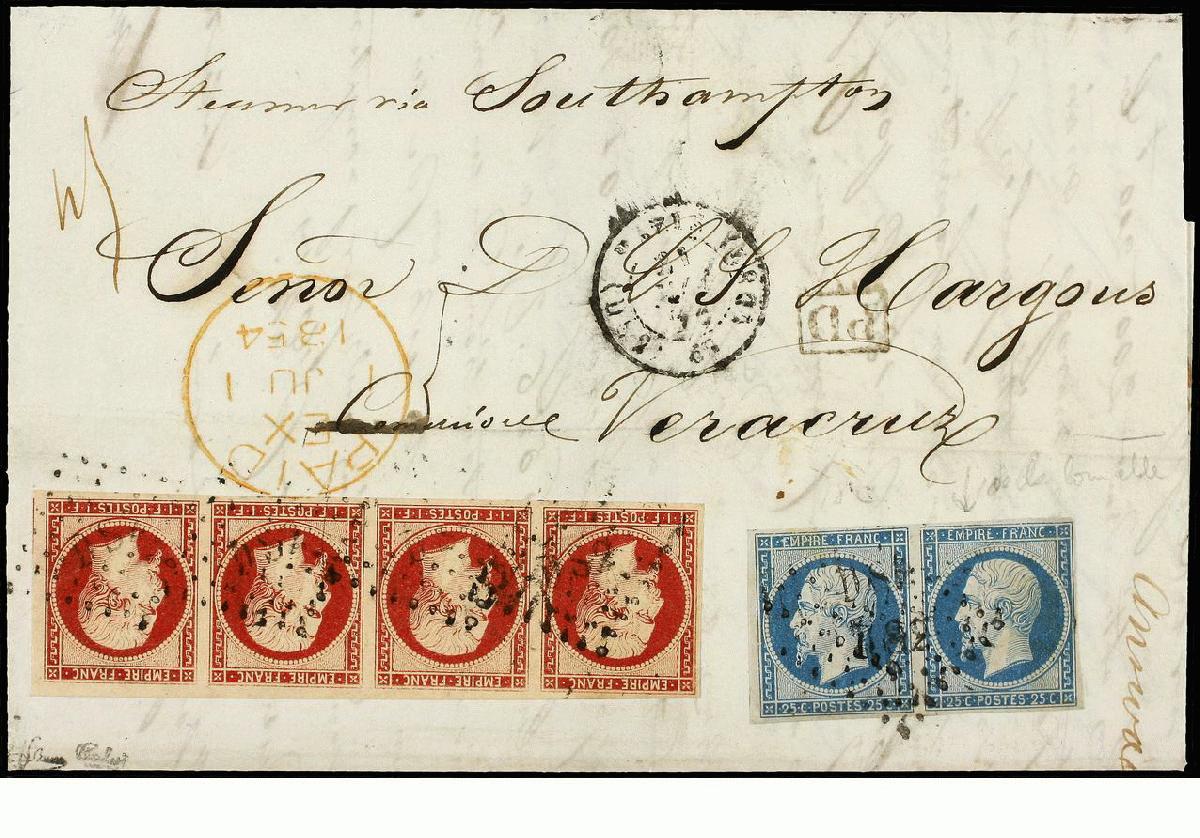 | Zusatzinformationen und Suchstichworte: | Soler y Llach - 788. Auktion 24. - 26. August 2023 Los 2135 Frankreich FRANCIA. 1854. PARÍS a VERACRUZ (México). 25 cts. azul pareja, un sello retoque ´Delacourcelle´ y dos márgenes restaurados y tira de cuatro del 1 Fr. carmín de color y márgenes excepcionales. Excepcional franqueo de gran belleza. Cert. VON DER WEID. Yv.14, 18 (4) Zuschlag 6.500,00 EUR |