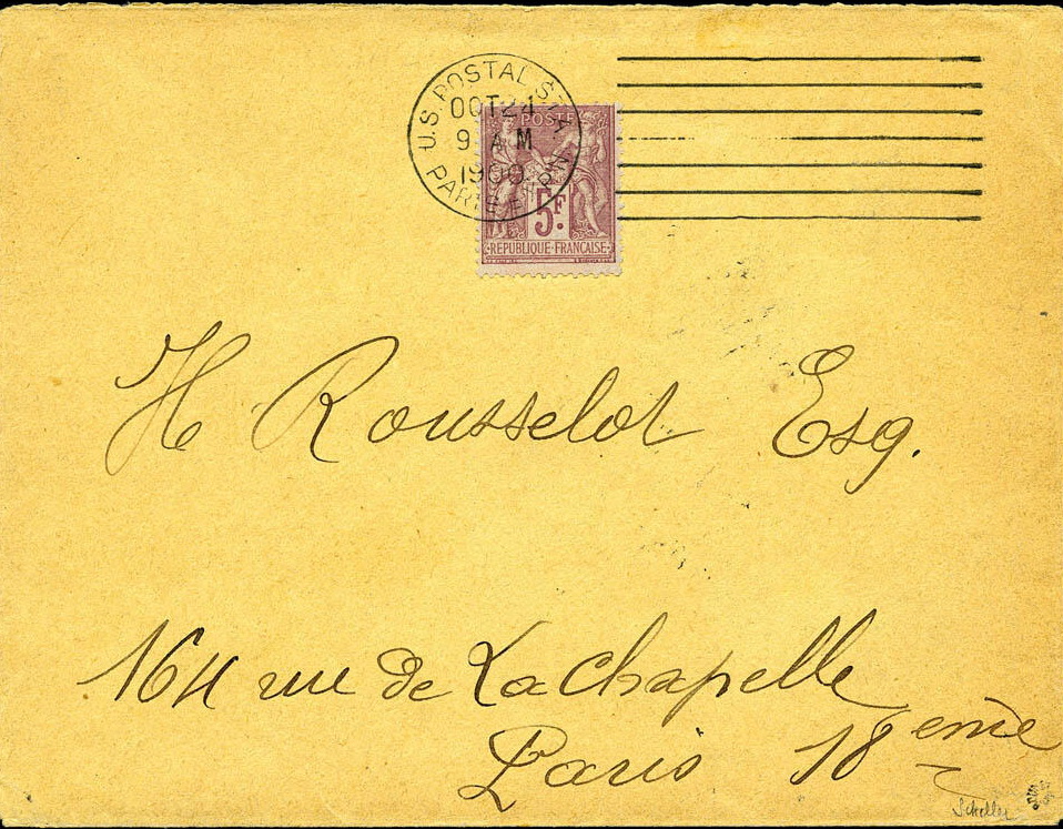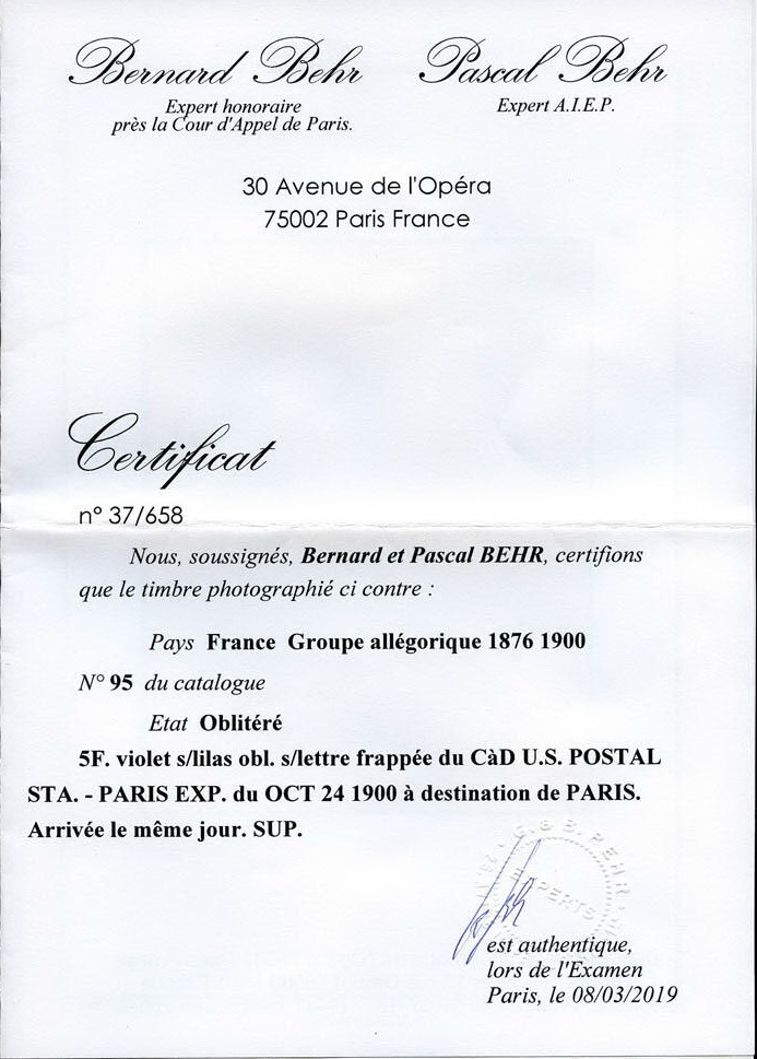 | Zusatzinformationen und Suchstichworte: | La Postale Philatélie 42. Auktion 7. Juli 2023 Los 968 Frankreich N°95, 5F violet sur lilas obl. Cachet Américain US POSTAL STA PARIS EXPN sur enveloppe pour PARIS. RARE. Superbe. (signé Scheller/Roumet/Certificats) Qualité: Oblitéré Cote: 3500 euros Ausruf 650,00 EUR |