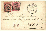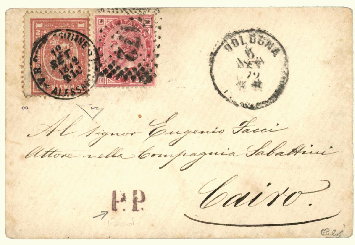| Zusatzinformationen und Suchstichworte: | Lugdunum 125. Auktion 18. September 2023 Los 1192 Ägypten (Königreich) 1872 ITALY 40c canc. 172 + BOLOGNA + EGYPT 1P canc. ALESSANDRIA + P.P on envelope to CAIRO (EGYPT). Rare combination with cancellations from BOLOGNA. DIENA Certificate (1991). See ZANARIA catalogue page 271. Superb Ausruf 600,00 EUR |