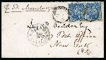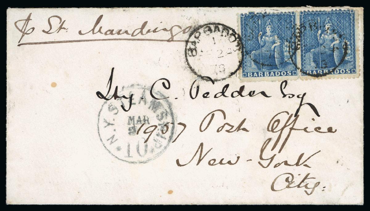 | Zusatzinformationen und Suchstichworte: | David Feldman S.A. - Great Britain and British Empire 26. - 29. Juni 2023 Los 40576 Barbados 1873 (Feb 24) Briefumschlag in die USA mit 1872 Wasserzeichen kleiner Stern (1d) blau sauber getrennte Zähnung 14,5-15,5 Paar, entwertet mit Barbados Kreisdatumsstempel, bestätigt für wagen bei privat Schiff oben links "per St. Mandringo", New York 10c Dampfer Kreisdatumsstempel daneben gesetzt, Pracht und selten, eine von nur zwei Umschlägen verzeichnet des 2d Taxierung bei privat Schiff in die USA, beide von der gleichen Korrespondenz (die anderen abgebildet in Fords Buch auf p. 132) ; Attest RPS (1975) Zuschlag 550,00 GBP |