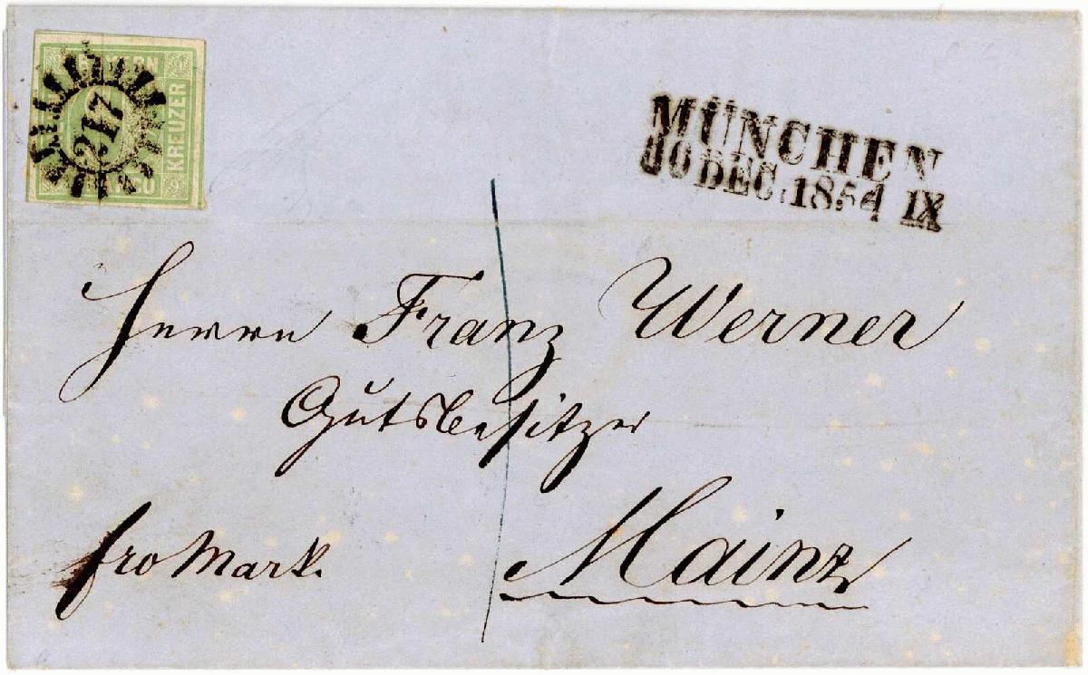 | Zusatzinformationen und Suchstichworte: | 232. Karl Pfankuch & Co Auktion 9. - 10. August 2023 Los 43 Altdeutschland Bayern 9 Kr. blaugrün, selt. Plattenfehler „Strich durch Wertziffer 9“, breitrandig mit MR „217“ München auf Kabinettbrief „fco. Marke“ nach Mainz, Attest Stegmüller Zuschlag 324,00 EUR |