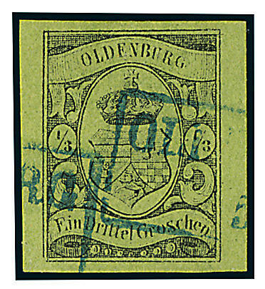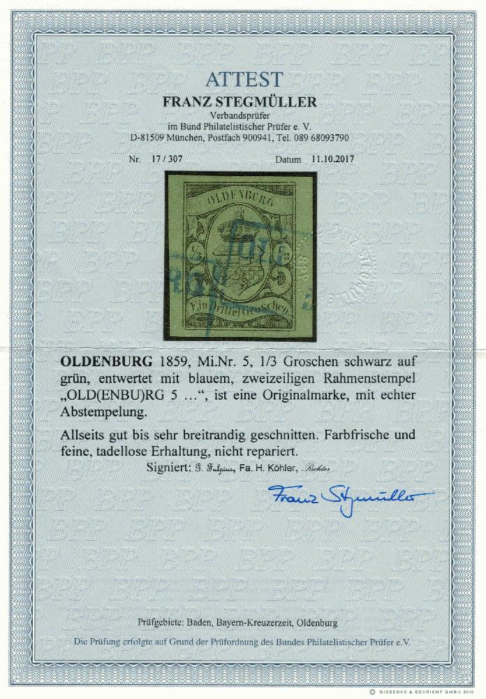 | Zusatzinformationen und Suchstichworte: | Dr. Derichs 171. Auktion 18. - 20. August 2023 Los 8907 Altdeutschland Oldenburg 1/3 Gr. schw./grün, vierseitig ungewöhnlich breitrandig und leuchtend frisch mit blauem Ra2 "Oldenburg". Luxus. In dieser besonders schönen und qualitativ vollig einwandfreien Erhaltung eine sehr seltene Altdeutschland-Marke. Fotoattest Stegmüller BPP: "Farbfrische und feine, tadellose Erhaltung, nicht repariert.". (Michel 3.600.-+) Ausruf 2.000,00 EUR |