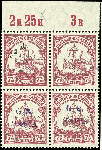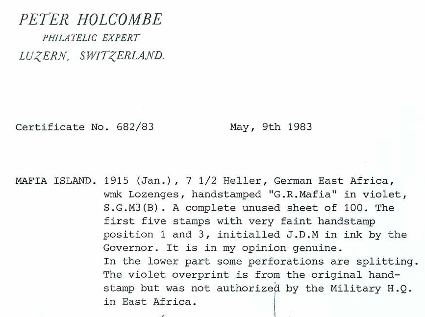 | Zusatzinformationen und Suchstichworte: | Dr. Reinhard Fischer 193. Auktion 21. - 22. Juli 2023 Los 3035 Deutsche Kolonien Ostafrika Brit. Besetzung 7 1/2 Heller, Aufdruck violett, Oberrand-Viererblock tadellos postfrisch, dabei die oberen Marken mit sehr schwachem Aufdruck (nahezu Blinddruck), deshalb die linke Marke handschriftlich vorderseitig signiert "J D M" (Lieutenant-Colonel J.D. Mackay, Gouverneur der Insel und Überdrucker der Marken). Der Viererblock stammt aus dem im Gibbs-Handbuch erwähnten letzten existierenden Originalbogen, der 1984 in der Schweiz versteigert und in der Nachfolge aufgeteilt wurde. Der Bogen enthielt lediglich zwei "J D M"-signierte Marken (Feld 1 und 3). Jede Marke tiefst gepr. Kilian, sowie Fotokopie des Attests Holcombe mit Kopie des Bogens von 1983 beiliegend. Sehr selten! Zuschlag 1.400,00 EUR |