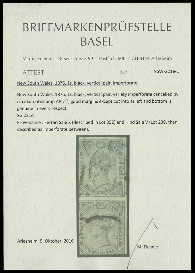 | Zusatzinformationen und Suchstichworte: | Filat AG Shop Neu Los 6257 (D) Neusuedwales 1876 QV 1/- black VARIETY IMPERFORATE PAIR (SG 221e). F/U pair with part cds AP 78 (?). An exhibition showpiece rarity for connoisseur being one of only three such recorded pairs extant. Photo-cert: Eichele BPB: "Provenance: Ferrary Sale X, June 1924 (described in Lot 352) and Hind Sale V, July 1934 (Lot 239 then as imperf between)." (cv£2750). See additional image and of certificate below Festpreis 3.850,00 CHF |