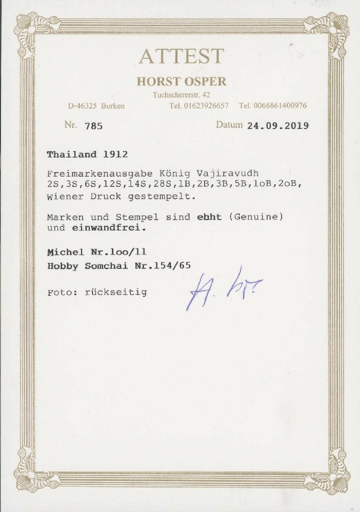 | Zusatzinformationen und Suchstichworte: | Ulrich Felzmann 37. e@uction 5. - 8. September 2023 Los 11320 Thailand 1912, King Vajiravudh, cpl. set of 12 values, very fine used, photo certificate Osper "... einwandfrei/faultless" (Hobby Somchai # 154-165) Ausruf 100,00 EUR |