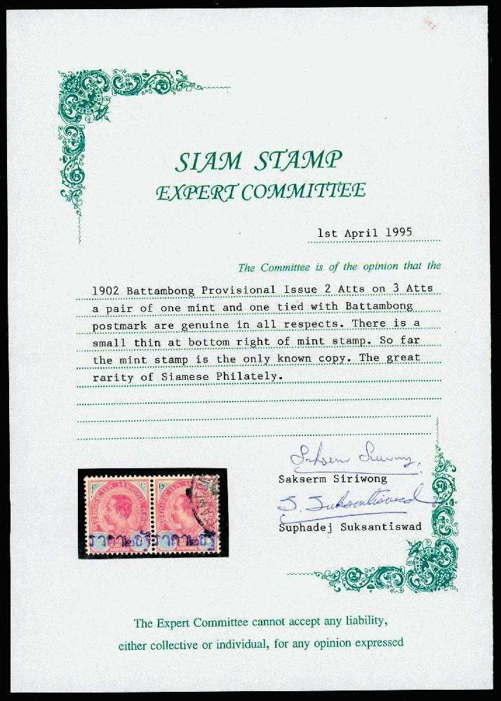 | Zusatzinformationen und Suchstichworte: | Klüttermann - 6. Auktion 27. Juli - 4. August 2023 Los 10502 Thailand Battembang Provisorium, 2 A auf 3 A rot/blau, ungebrauchte sehr gut zentrierte Marke mit vollem Originalgummi, minimal dünne Stelle rückseitig oben, extrem seltene Marke, FA Siam Stamp Expert Comitee für ein Paar mit gestempelter Marke Ausruf 3.500,00 EUR |