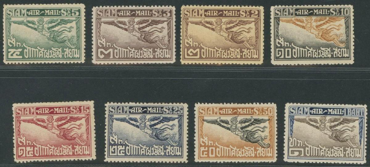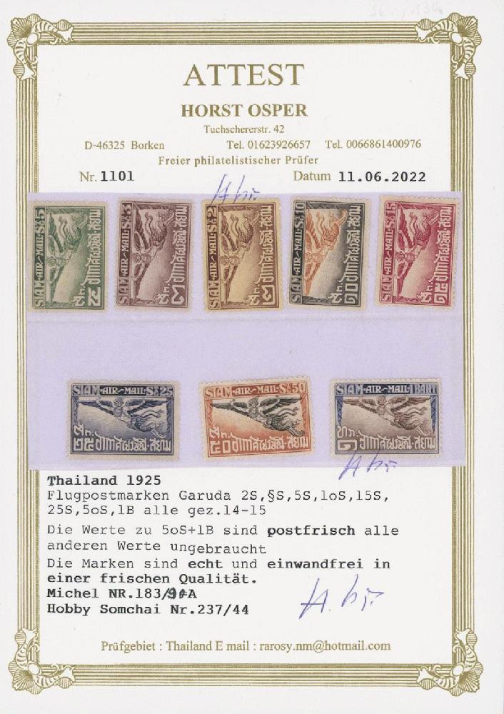 | Zusatzinformationen und Suchstichworte: | Ulrich Felzmann 37. e@uction 5. - 8. September 2023 Los 11322 Thailand 1925, Airmails, all perf. 14-15, high values 50 S + 1 B mint never hinged, balance mint hinged, photo certificate Osper "... perfect in fresh quality" (Hobby Somchai # 237-244) Ausruf 130,00 EUR |
