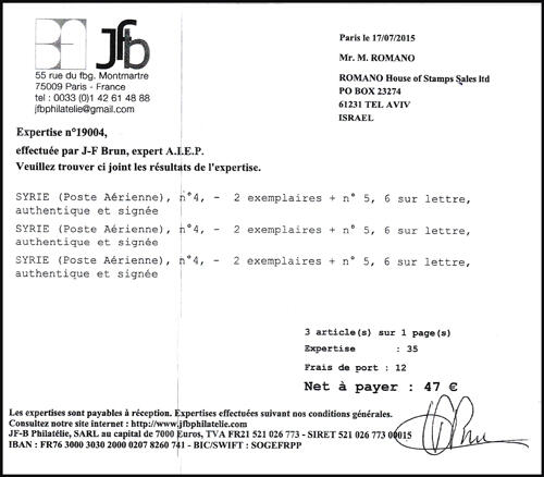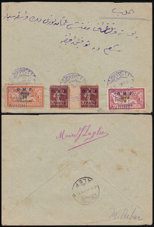 | Zusatzinformationen und Suchstichworte: | Romano Fernauktion No. 45 6. Juli 2023 Los 166 Syrien Syrien, französischer französischer Verwaltungs, Luftpost, 1921 (Sep 21), Brief von Aleppo nach Alexandria mit die O. M. F. Syrie" und Wert auf Zweilinien - 1921 overprintson POSTE PAR AVION purpur Überdruck auf vorhergehend französischer Markenfrankatur beinhaltet Zwischenstg-Paar von 1Syrian Piaster auf 20c POSTE PAR AVION purpur überdruckte Marke, nur 3 bekannt auf dem Brief. (Mi. 170; Yt. PA4; Sg. 78), dabei auch die 5pi auf 1 Fr. und 10pi auf 2 Fr. (Mi. 161-162, Yt. SY-FR 65-66, Sg. SY 75-76). Alle entwertet durch ________Arrival ALEP Kreisdatumsstempel auf Rückseite datiert __________Nice und sehr seltener Brief. Signiert von Fachmann unten Vorderseite - Brun. Schätzpreis $500 - 750. _____It erscheint die 21 von 21 Sep hat verkehrt Ziffern und die aufgenommen mark ist 13 Sep. Zuschlag 260,00 USD |
