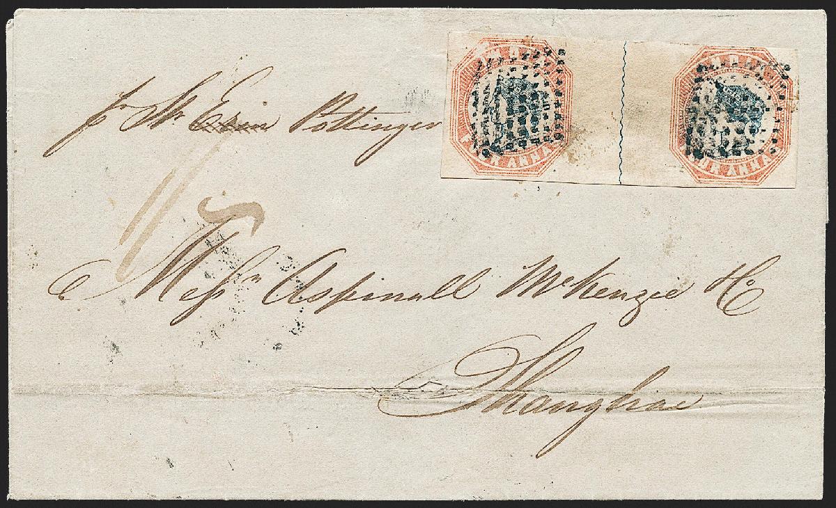 | Zusatzinformationen und Suchstichworte: | Robert A. Siegel - The Magnolia Collection: India Postal History & Stamps Used Abroad 11. Mai 2023 Los 249 Singapur Gebraucht in Straits Settlements - - Singapur, 1854,4a blassrot & blau, Erstauflage, Kopf Die I, Rahmen Die I (6; SG 18). Waagrechtes Paar mit weiter Abstand und Scheidelinie, meist breitrandig zu mit Mühe und Not berührt außen Randlinie oben der rechten Marke, entwertet durch Diamant von Punkte Stempel auf Faltbrief von Singapur nach Schanghai, China, datiert Singapur Dec., 1854, Absenderanweisung "p Str. Erin Pottinger", Hongkong Januar 1855 Übergangsstempel, linke Marke mit kleinem Oberfläche Kratzer oben links und leichte Stockflecke ab Marke gebraucht, weder Erwähnte auf beiliegendem Attest Pracht und seltene Verwendung einer 4-ANNAS Erstauflage Lithographie WIDE-SETTING Paar auf Brief aus Singapur nach China. Ex Tay Peng Hian. Mit 2012 R. P. S. Attest. Ausruf 7.500,00 USD |