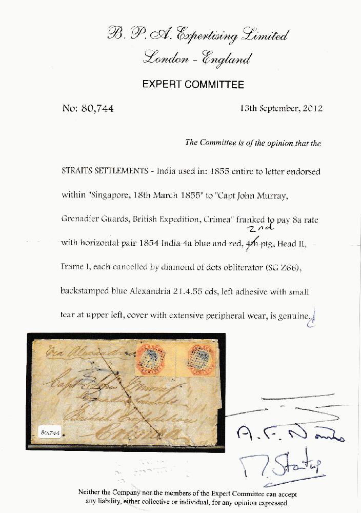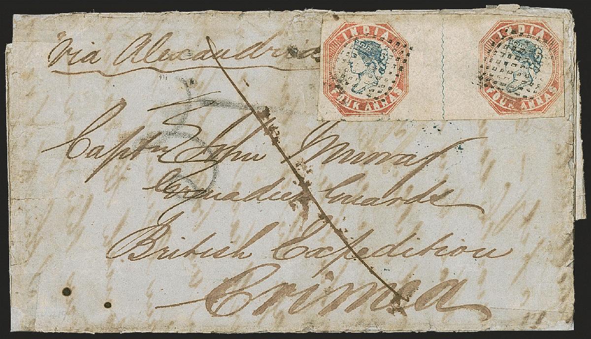 | Zusatzinformationen und Suchstichworte: | Robert A. Siegel - The Magnolia Collection: India Postal History & Stamps Used Abroad 11. Mai 2023 Los 250 Singapur Gebraucht in Straits Settlements - - Singapur, 1854,4a rot und blau, zweite Auflage, Kopf Platte II, Rahmen Die I (6D; SG 19). Waagrechtes Paar mit weiter Abstand und Scheidelinie, meist breitrandig zu äußere Rahmenlinie gerade berührt rechts, entwertet durch Diamant von Punkte Stempel auf datiertem Faltbrief Singapur Mar. 18,1855 und adressiert an "Capt. John Murray, Leibgrenadier Wächtern, Britisch Forschungsreise, Krim", Absenderanweisung "über Alexandria", blau Alexandria Transit Datumsstempel auf Rückseite, linke Marke im Paar mit kleinem Einriss oben, insgesamt altem und außen Bogen von Brief ausgiebig gestützt fein. Eine seltene und bemerkenswertes Anwendung einer 4-ANNAS Lithographie WIDE-SETTING Paar auf einem Brief ab Singapur ein einen Offizier dienende auf der Krim. Nur fünf 1854 Ausgabe Umschlägen zu die Krim sind bekannt, drei davon haben 4-ANNAS Briefmarken. Die Krimkrieg war kämpfte ab Oktober 1853 zu Februar 1856 zwischen Russland und die Bundes des osmanisches Kaiserreich, Frankreich, Großbritannien, und Sardinien. Die geopolitisch und religiöse Natur vom Krieg, verbunden mit es zu sein eines der ersten steht im Widerspruch benutzen modern technology, als da wären Fotos, geschaffen ein unpopulär Meinung im Westen. Kampfplatz Bedingungen litt zu Erkrankungen jenes ausgelöst mehr Verwundeten als die Kämpfe sich. Die Buchstaben im Hauptmann Murray Korrespondenz befördern die entsetzlich Bedingungen während der Krimkrieg. Ex Dr. Wood und Taylor. Mit 2012 B. P. A. Attest. Ausruf 10.000,00 USD |