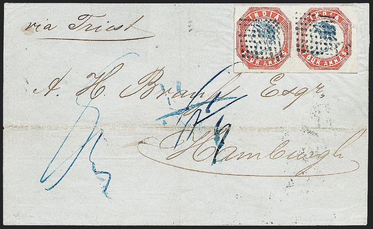 | Zusatzinformationen und Suchstichworte: | Robert A. Siegel - The Magnolia Collection: India Postal History & Stamps Used Abroad 11. Mai 2023 Los 255 Singapur Gebraucht in Straits Settlements - - Singapur, 1854,4a rot und blau, 4. Druck, Kopf Die III, Rahmen Platte II (6F; SG 23). Waagrechtes Paar, groß zu breite Ränder beidseitig, intensive Farben, entwertet durch Diamant von Punkte auf 1855 Faltbriefhülle ab Singapur nach Hamburg, Deutschland, Laufvermerk auf Seitenklappe verzeichnet Singapur Ursprung, Absenderanweisung "über Triest", blau Portostempel übersichtlich knüpft Paar, Hamburg Ankunftsstempel Pracht. Ein Schmuckstück Paar der 4-Anna vierte Druck Lithographie verwendet auf Brief aus Singapur nach Deutschland. Ex grau, Piccus, Heddergott, und Dr. Kornan. Mit 1986 R. P. S. Attest (Bundesländer "nicht entwertet ist betrachtet echt, "aber die Paar ist entwertet) Ausruf 7.500,00 USD |
