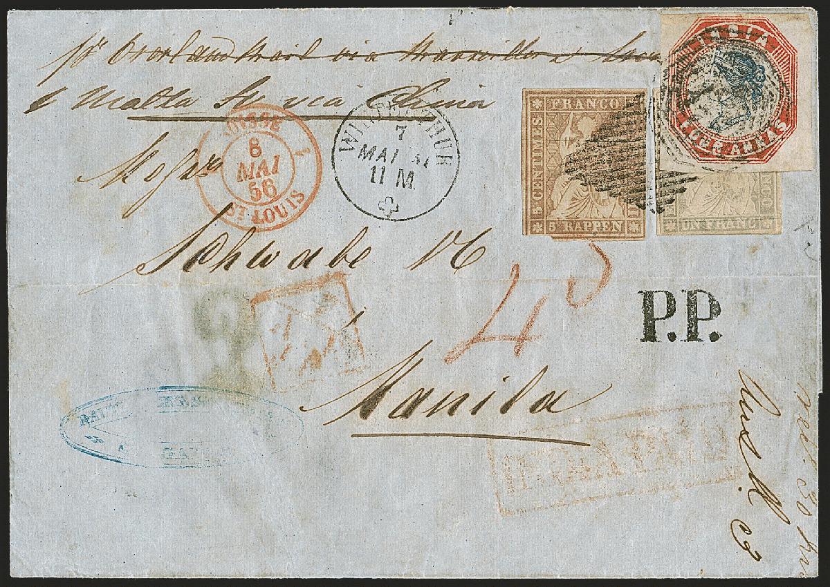 | Zusatzinformationen und Suchstichworte: | Robert A. Siegel - The Magnolia Collection: India Postal History & Stamps Used Abroad 11. Mai 2023 Los 256 Singapur The importance of this cover is derived from each significant element. The Switzerland Seated Helvetia stamps are extremely rare on covers to the Philippines--in this case, they paid the rate for French mail to Singapore via Marseilles and Alexandria. The India 4a Lithograph is very rare on covers from Singapore--in this case it paid the rate to Manila. The "2" (reales) handstamp represents the amount charged to the addressee for Spanish internal postage. Combined, we have classic European stamps, the bicolored British Empire stamp used at a post office in the Straits Settlements, and postage collected by a Spanish colonial post office in the Philippines. Ausruf 40.000,00 USD |