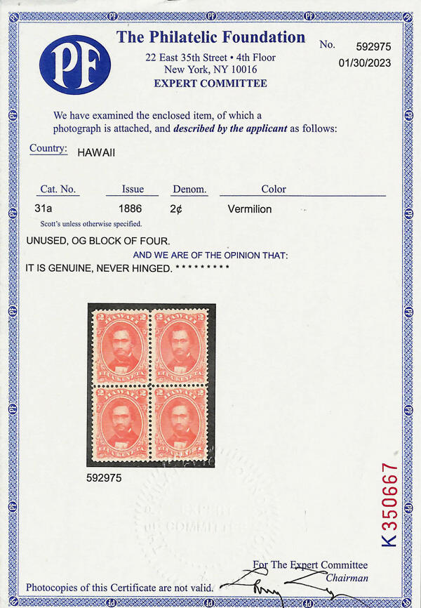 | Zusatzinformationen und Suchstichworte: | Kelleher #2005 Auktion 7. - 9. August 2023 Los 1101 Hawaii 1864, König Kamehameha IV, 2¢ zinnober (Scott 31a), Originalgummi, postfrisch, frisch und sauber mit pulsierend Farbe, feinst bis Pracht, mit 2023 P. F. Attest für Viererblock, diese Position 1. Scott $130 Zuschlag 90,00 USD |