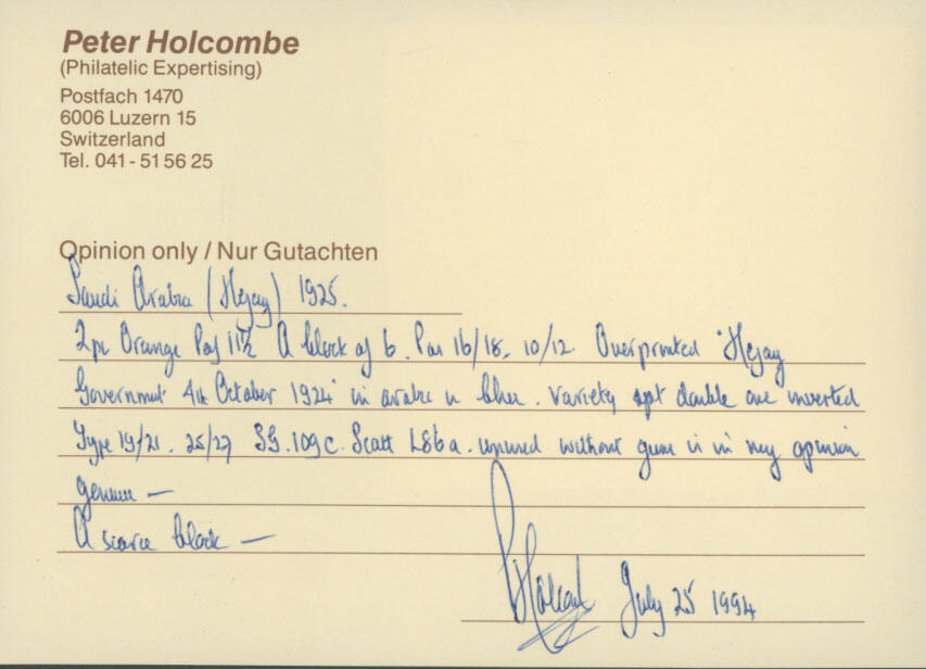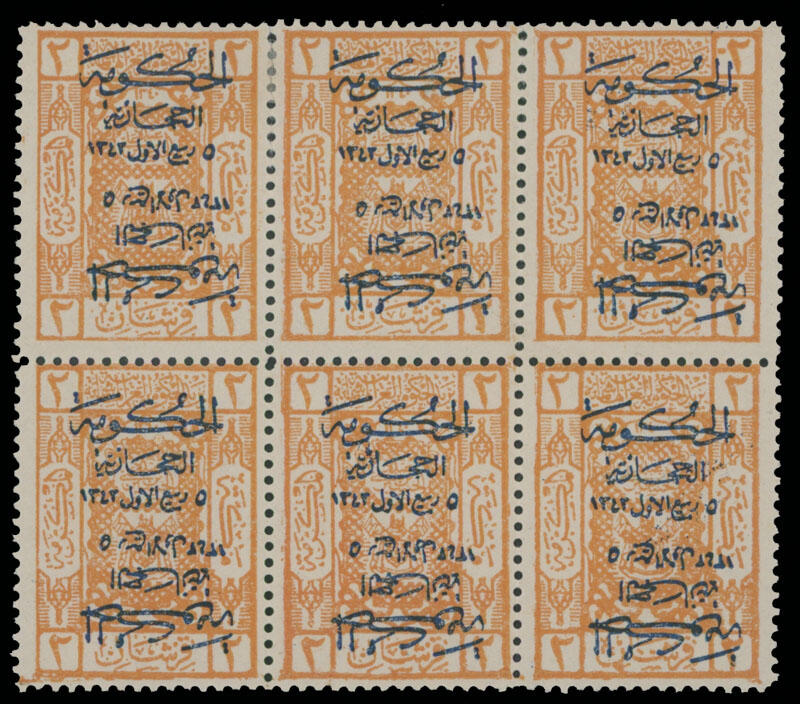 | Zusatzinformationen und Suchstichworte: | Raritan Stamps - 97. Auktion 30. - 31. August 2023 Los 1240 Hedschas KINGDOM OF THE HEJAZ: 1925, Jedda double (one inverted) blue overprint on 2pi orange, perforation 11½, block of six (3x2), unused, no gum, VF and scarce multiple, P. Holcombe certificate, SG #109c, £1,080++ Ausruf 200,00 USD |