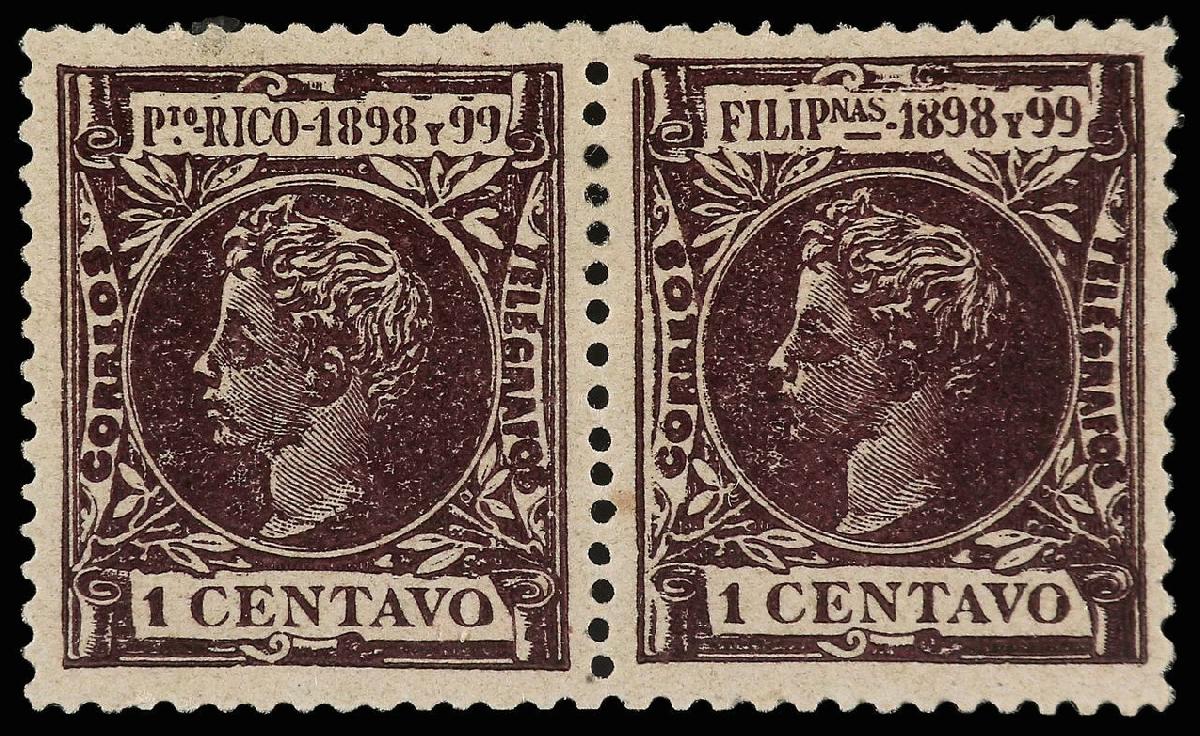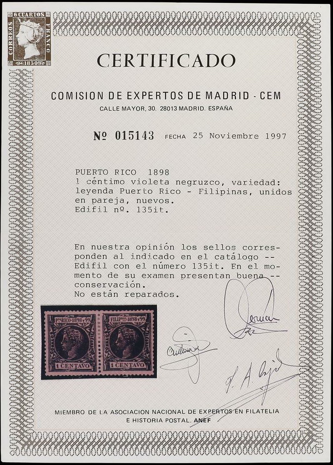 | Zusatzinformationen und Suchstichworte: | Soler y Llach - 791. Auktion - Spanien, Kolonien und der Rest der Welt 13. - 14. September 2023 Los 2992 Puerto Rico COLONIAS ESPAÑOLAS: PUERTO RICO. 1 ctvo. violeta. Pareja con el ERROR ´PTO. RICO + FILIPINAS´ en pareja. Variedad muy controvertida junto con la pareja capicua, probablemente se trate de una reimpresión privada realizada en la época (existen cartas originales con la pareja capicua), existe también una falsificación realizada recientemente. De todas maneras pieza catalogada en Edifil y muy rara de la que se conocen menos de cinco parejas. Cert. CEM. Ed.135C. Ausruf 500,00 EUR |