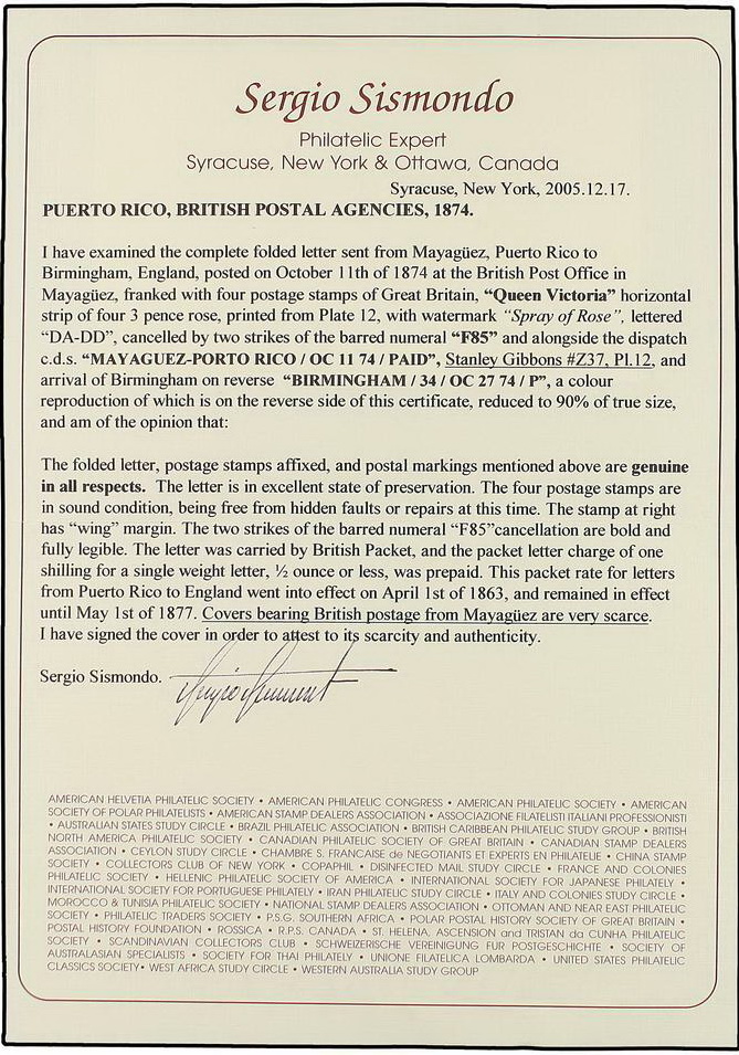 | Zusatzinformationen und Suchstichworte: | Soler y Llach - 788. Auktion 4. - 5. Juli 2023 Los 2708 Puerto Rico PUERTO RICO. 1874. MAYAGUEZ a INGLATERRA. Circulada con sellos ingleses de 3p. rosa tira de cuatro (pl. 12). Mat. B.P.O. F 85 y fechador MAYAGUEZ PORTO RICO / PAID. Leve pliegue vertical de archivo que afecta a un sello. Muy bonito y RARO franqueo. Ex col. Andre Bolleu y Gaspar Roca. Cert. SISMONDO Ausruf 1.000,00 EUR |