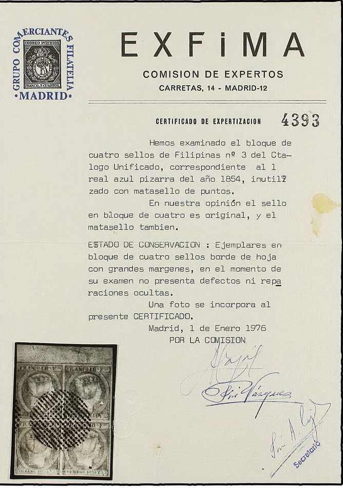 | Zusatzinformationen und Suchstichworte: | Soler y Llach - 788. Auktion 4. - 5. Juli 2023 Los 2581 Philippinen FILIPINAS. 1 real gris azulado (pos. 2, 3, 7, 8 de la hoja), mat. CÍRCULO DE PUNTOS. Bloque de cuatro, borde de hoja superior. ESPECTACULAR y MUY RARO en esta calidad. EX. BOKER. Cert. GRAUS y EXFIMA. Ed.3b (4) Ausruf 1.500,00 EUR |