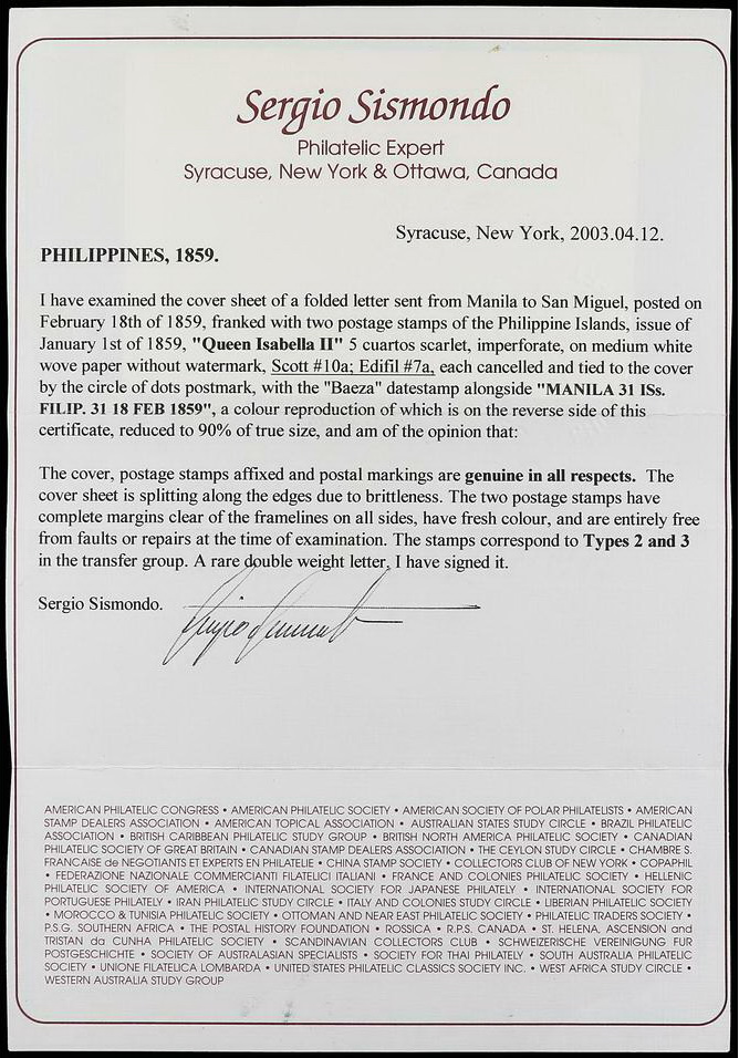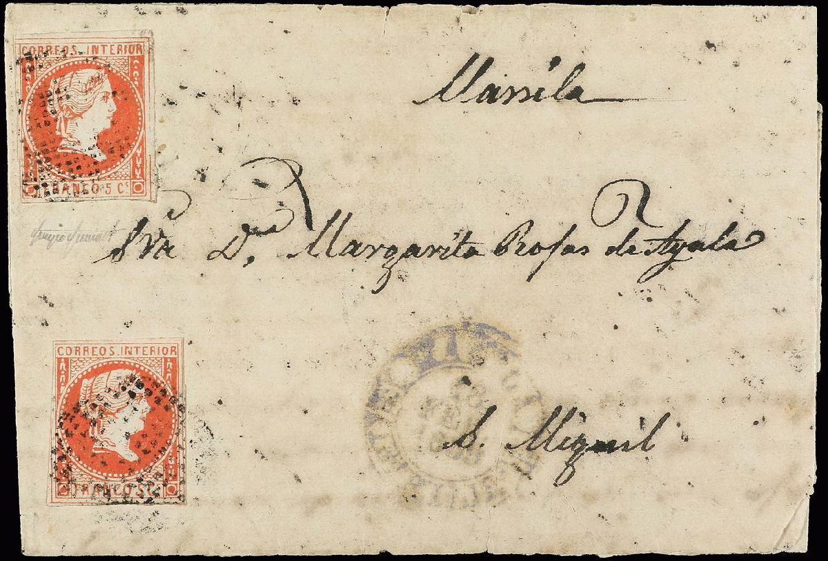 | Zusatzinformationen und Suchstichworte: | Soler y Llach - 788. Auktion 4. - 5. Juli 2023 Los 2622 Philippinen FILIPINAS. 1859. MANILA a SAN MIGUEL. 5 cuartos bermellón, mat. círculo de puntos y fechador MANILA/IS. FILIP. en azul, sobre con roturas y de papel frágil. Raro franqueo. Cert. SISMONDO. Ed.7 (2) Ausruf 350,00 EUR |