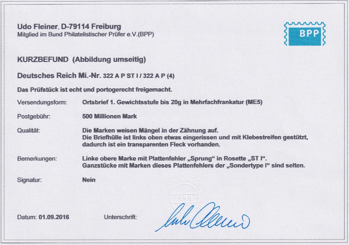 | Prüfer: | Fleiner, Udo (BPP (Bund Philatelistischer Prüfer)) |