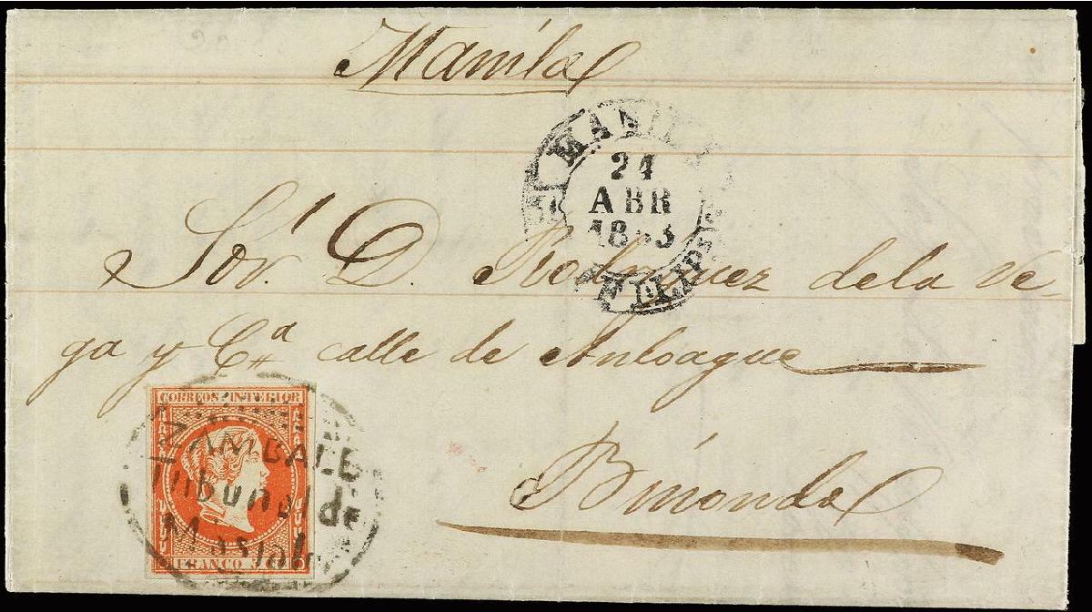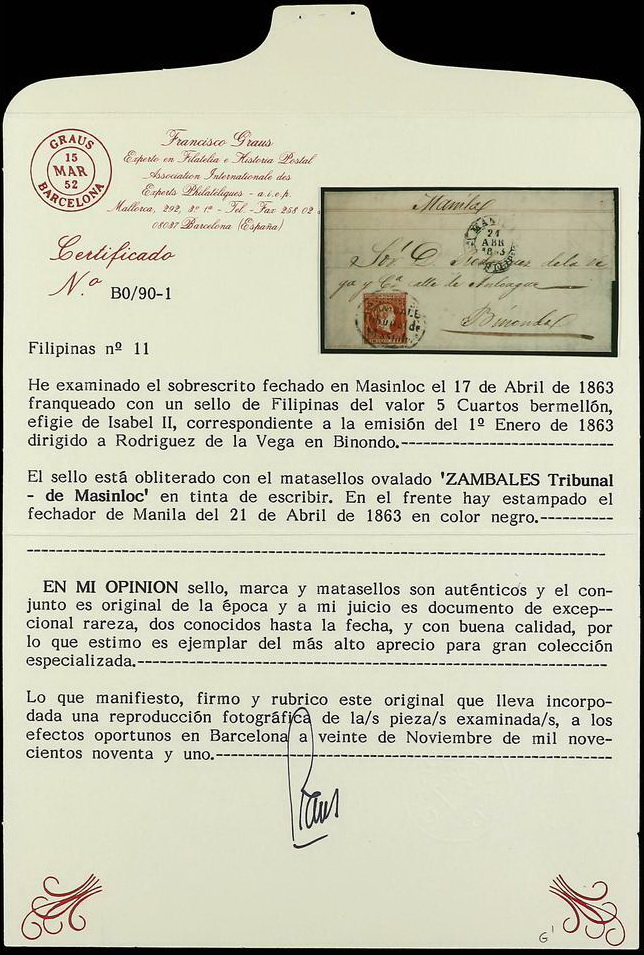 | Zusatzinformationen und Suchstichworte: | Soler y Llach - 788. Auktion 4. - 5. Juli 2023 Los 2639 Philippinen FILIPINAS. 1863. MASINLOC a BINONDO. Carta completa con sello de 5 cuartos rojo, mat. ovalado ZAMBALES/TRIBUNAL DE/MASINLOC y fechador de Manila al lado estampado en tránsito. PRECIOSA y MUY RARA. Cert. GRAUS y EXFIMA. Ex. col. BOKER y LANGE. Ed.11 Ausruf 3.000,00 EUR |
