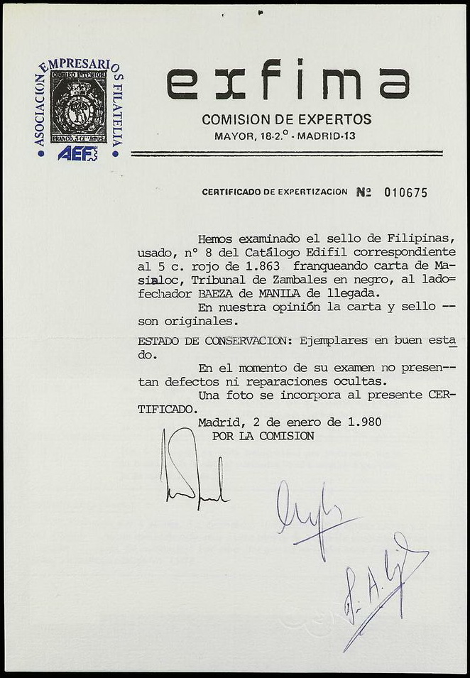 | Zusatzinformationen und Suchstichworte: | Soler y Llach - 788. Auktion 4. - 5. Juli 2023 Los 2639 Philippinen FILIPINAS. 1863. MASINLOC a BINONDO. Carta completa con sello de 5 cuartos rojo, mat. ovalado ZAMBALES/TRIBUNAL DE/MASINLOC y fechador de Manila al lado estampado en tránsito. PRECIOSA y MUY RARA. Cert. GRAUS y EXFIMA. Ex. col. BOKER y LANGE. Ed.11 Ausruf 3.000,00 EUR |