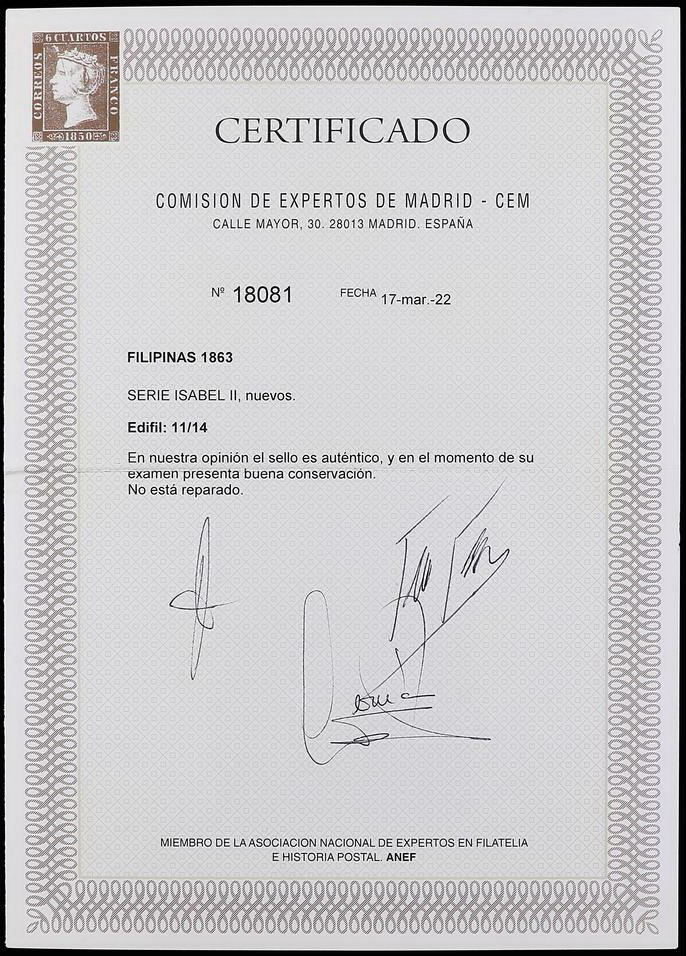 | Zusatzinformationen und Suchstichworte: | Soler y Llach - 788. Auktion 4. - 5. Juli 2023 Los 2640 Philippinen FILIPINAS. 1 real violeta (sin goma, no gum) y 2 reales azul. RAROS y de LUJO. Se incluye Ed. 11 y 12. Cert. CEM. Ed.(*)13, *14 Ausruf 850,00 EUR |