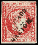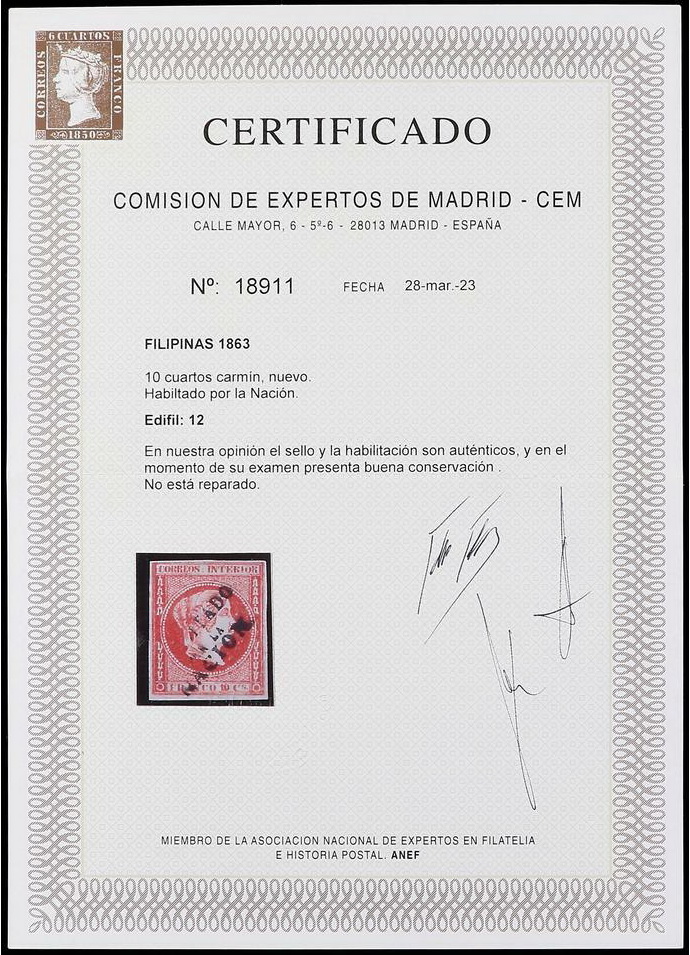 | Zusatzinformationen und Suchstichworte: | Soler y Llach - 788. Auktion 4. - 5. Juli 2023 Los 2655 Philippinen FILIPINAS. 10 cuartos carmín (Ed. 12) HABILITADO / POR LA / NACIÓN sello no reseñado en Edifil pero sí en Scott con el nº 30A (6.000$ US). Sello extremadamente raro, estimamos que existen menos de 5 ejemplares. Primera vez que lo ponemos en venta, gran rareza del período español en Filipinas. Cert. CEM Zuschlag 5.000,00 EUR |