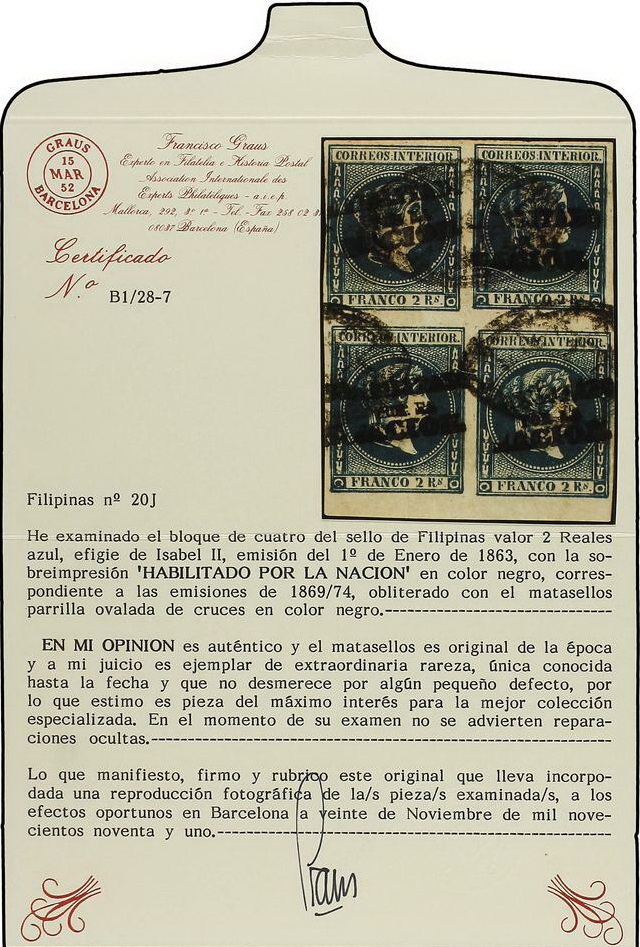 | Zusatzinformationen und Suchstichworte: | Soler y Llach - 788. Auktion 4. - 5. Juli 2023 Los 2656 Philippinen FILIPINAS. 2 reales azul. Bloque de cuatro con sobrecarga a mano HABILITADO / POR LA / NACIÓN. BORDE INFERIOR DE HOJA. Pieza excepcional y rarísima. Único bloque conocido de éste sello. Ex. BOCKER, ALFARO, LANGE. Cert. GRAUS y EXFIMA. Ed.20J (4) Ausruf 2.500,00 EUR |