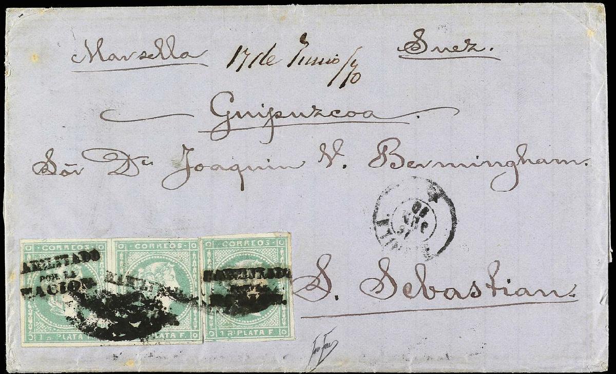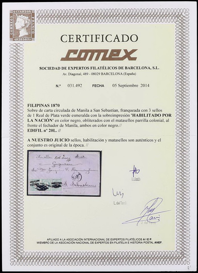 | Zusatzinformationen und Suchstichworte: | Soler y Llach - 788. Auktion 4. - 5. Juli 2023 Los 2665 Philippinen FILIPINAS. 1870. MANILA a S. SEBASTIAN. 1 real verde amarillo, sello y pareja HABILITADO / POR LA / NACIÓN, mat. parrilla colonial y fechador de Manila, al dorso llegada. Precioso y raro franqueo con triple porte. Cert. COMEX. Ed.20L (3) Zuschlag 600,00 EUR |