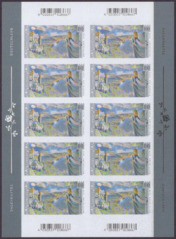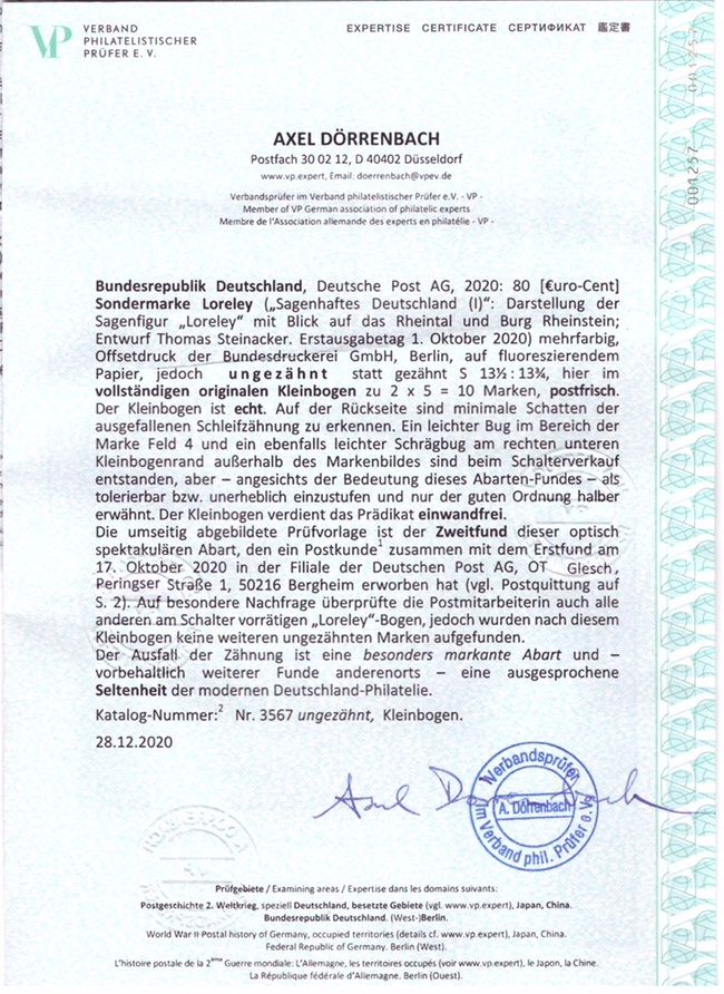 | Zusatzinformationen und Suchstichworte: | Bund Mi-Nr. 3567 ungezähnt postfrisch (derzeit noch nicht in der ungezähnten Variante in den Michel-Katalogen erfasst), Motiv "Loreley", Ausgabe am 01.10.2020. Weitere Informationen werden in dem umfangreich & ausführlich gehaltenen Attest aufgeführt. |