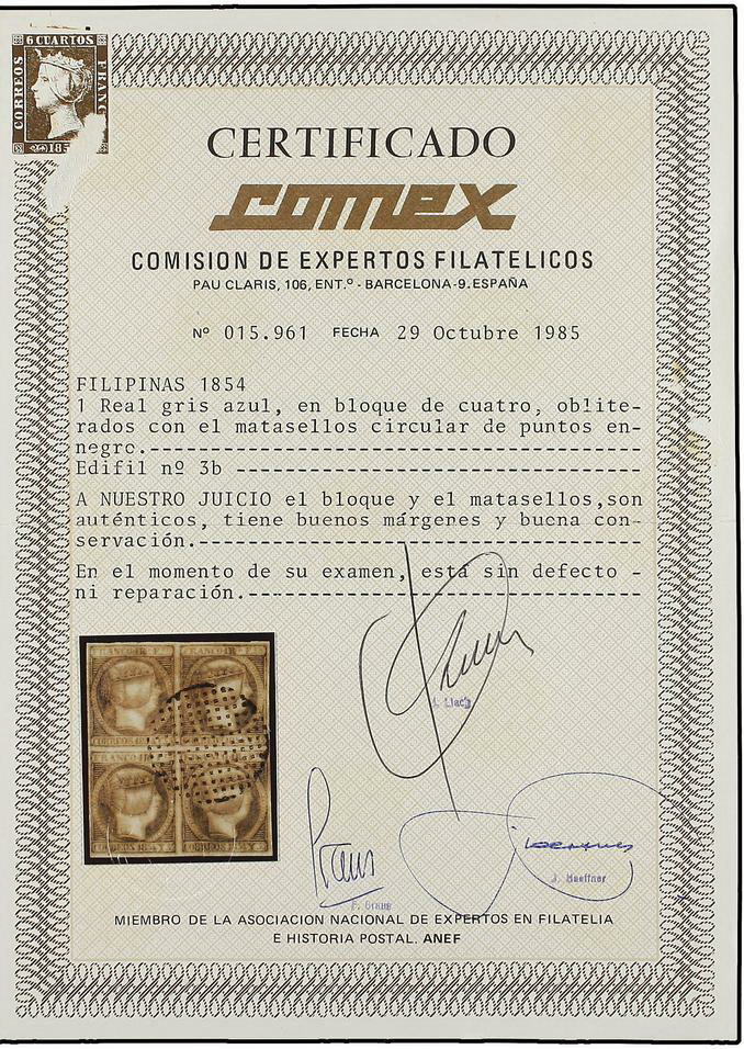 | Zusatzinformationen und Suchstichworte: | Soler y Llach - 791. Auktion - Spanien, Kolonien und der Rest der Welt 13. - 14. September 2023 Los 2816 Philippinen COLONIAS ESPAÑOLAS: FILIPINAS. 1 real azul gris. Bloque de cuatro, mat. CÍRCULO DE PUNTOS. MAGNÍFICO y RARO en esta calidad. Cert. COMEX y EXFIMA. Ed.3b (4) Ausruf 1.200,00 EUR |