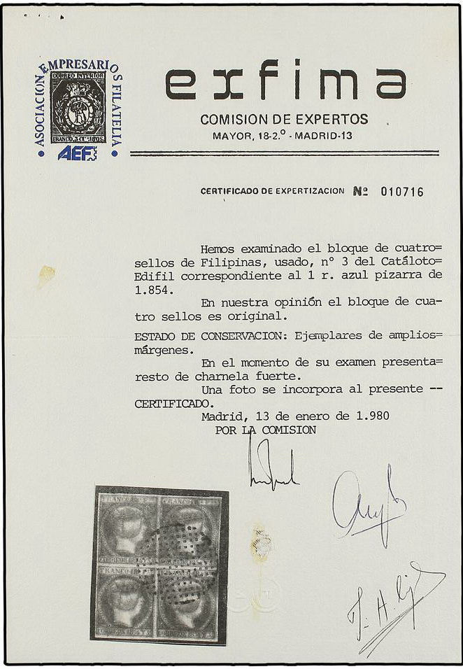 | Zusatzinformationen und Suchstichworte: | Soler y Llach - 791. Auktion - Spanien, Kolonien und der Rest der Welt 13. - 14. September 2023 Los 2816 Philippinen COLONIAS ESPAÑOLAS: FILIPINAS. 1 real azul gris. Bloque de cuatro, mat. CÍRCULO DE PUNTOS. MAGNÍFICO y RARO en esta calidad. Cert. COMEX y EXFIMA. Ed.3b (4) Ausruf 1.200,00 EUR |