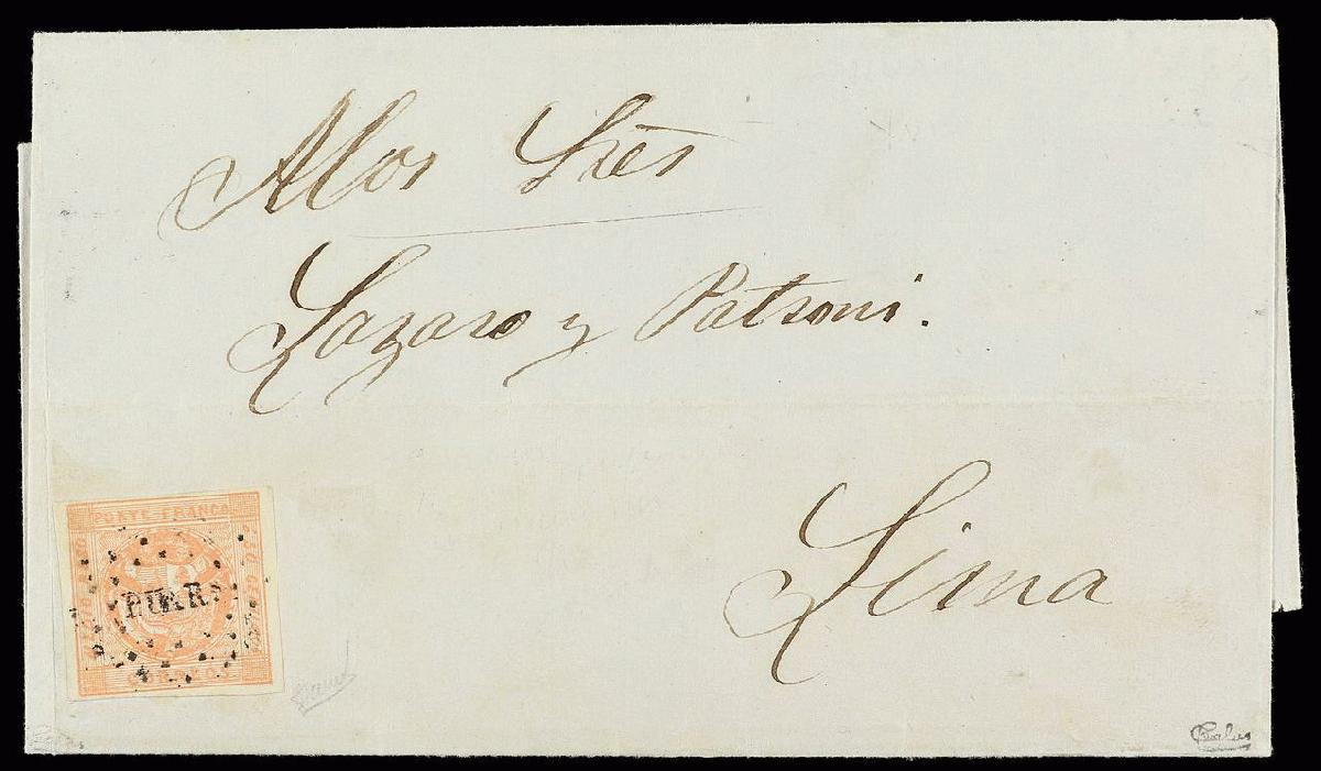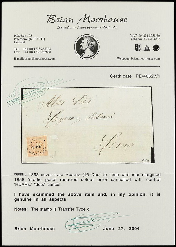 | Zusatzinformationen und Suchstichworte: | Soler y Llach - 788. Auktion 4. - 5. Juli 2023 Los 2551 Peru PERU. 1858. HUARAZ a LIMA. 1/2 peso rosa rojo ERROR DE COLOR mat. círculo de punto HUARS. MAGNÍFICO y MUY RARO en carta. Firmas JANET y CALVES y cert. B. MOORHOUSE. Sc.3BA Zuschlag 4.200,00 EUR |